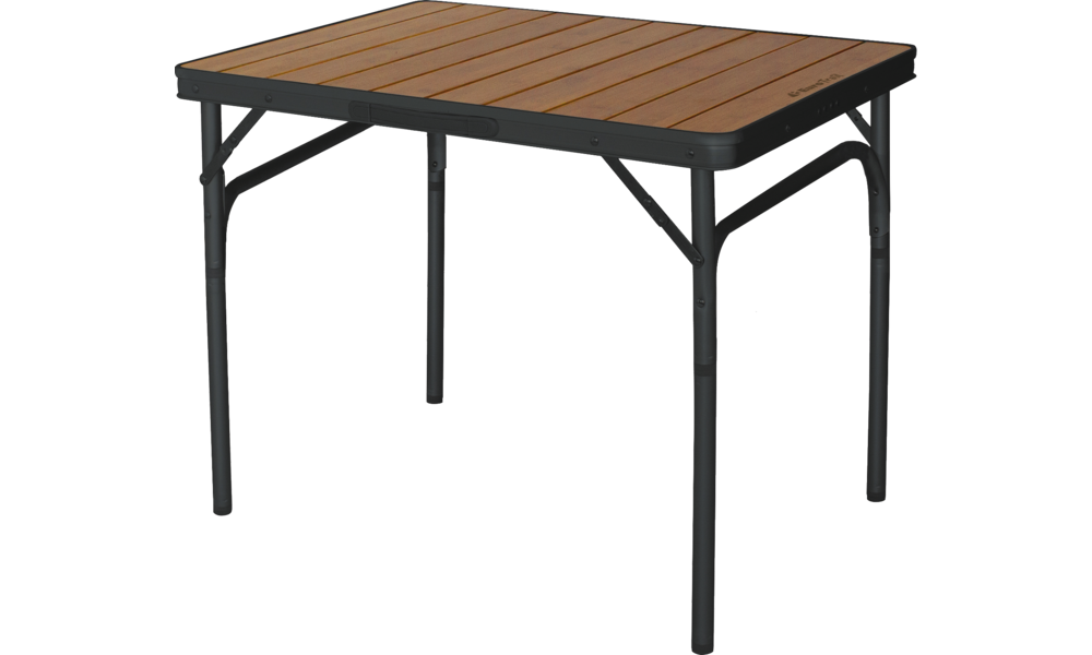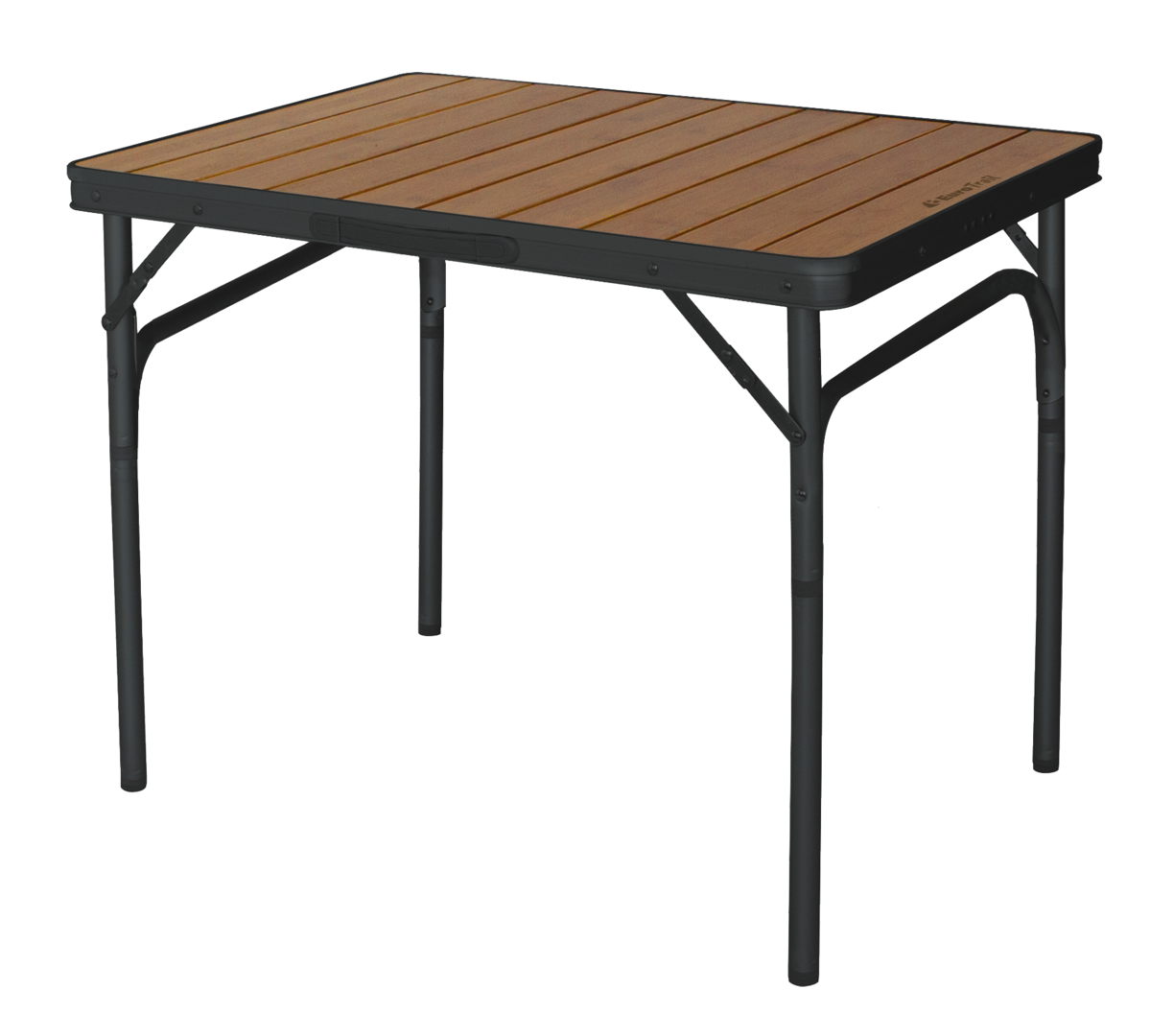 Tisch CHARELLE. Campingtisch mit wasserfester Bambusplatte. Robuster und stabiler Aluminiumrahmen in zwei verschiedenen Höhen verstellbar. Verstellbare Füße. Rah-men ist leicht zusammenklappbar. Belastbarkeit 50 kg.