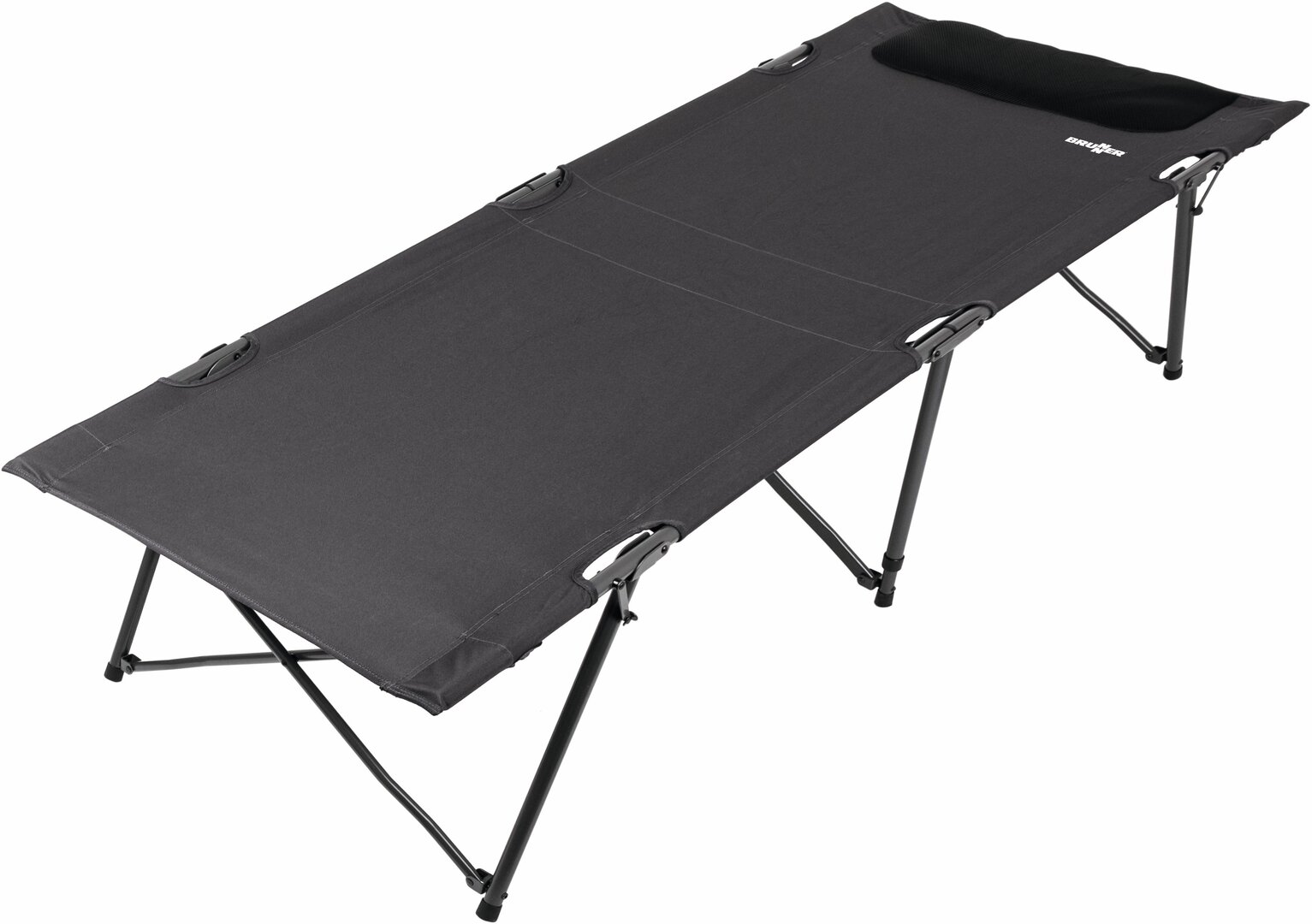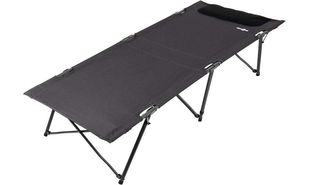 Stabiles Feldbett mit speziell konstruiertem Faltrahmen, der im Nu auf- und wieder zusammengeklappt werden kann. Komfortable Liegefläche aus widerstandsfähigem Polyestergewebe mit integrierter, gepolsterter Kopfauflage.