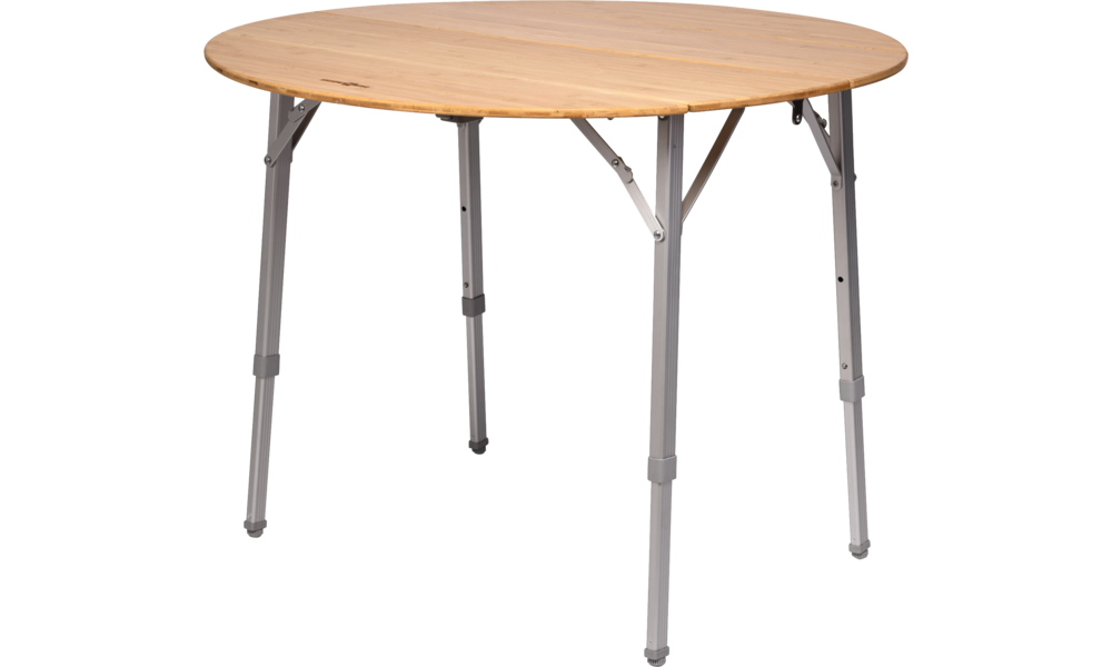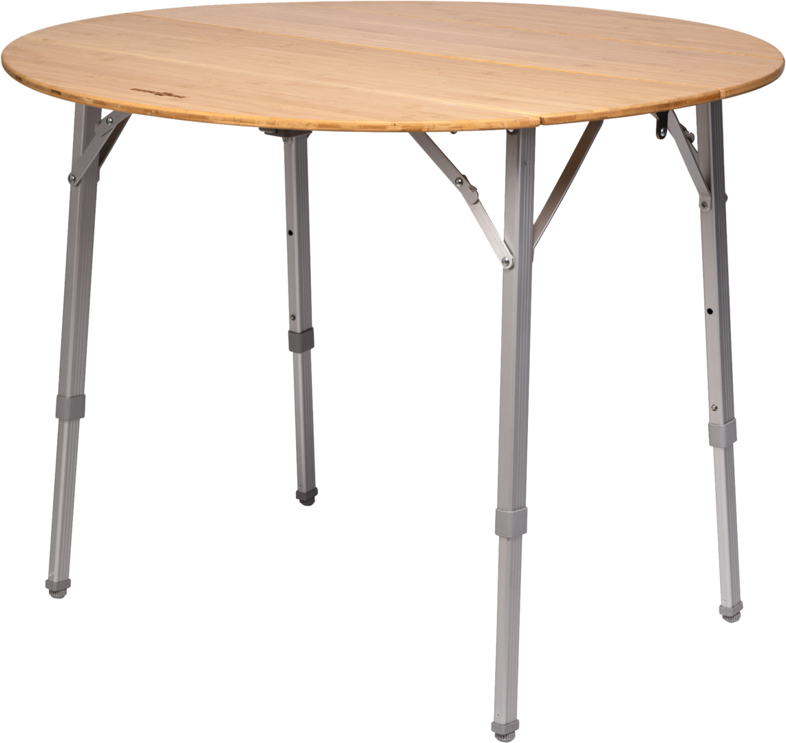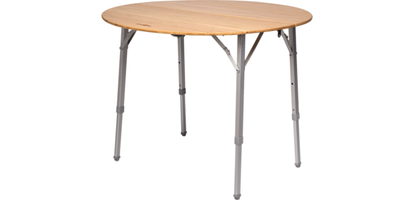Freizeittisch mit Metallgestell und Bambus-Tischplatte.