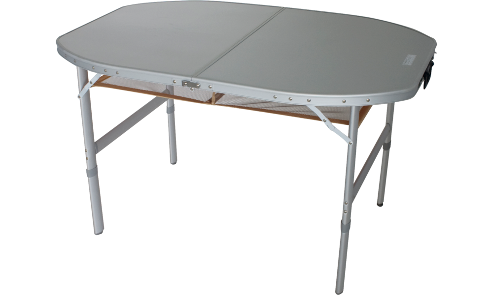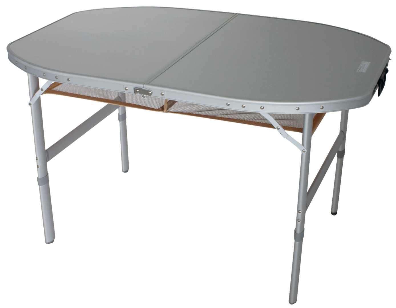 Tisch CHARTRES. Ovaler Aluminium-Klapptisch mit verstellbaren Tischbeinen. Die Tischplatte ist zu 100 % wasserfest und hitzebeständig. Mit praktischer Netzablage. Belastbarkeit 50 kg.