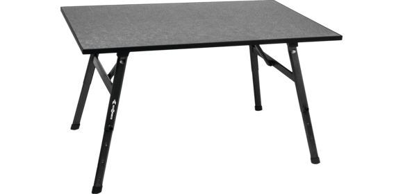 Sehr stabiler, ultraleichter Tisch mit mittig klappbarer Tischplatte und funktionellem Aluminiumgestell. Dank der speziellen Konstruktion