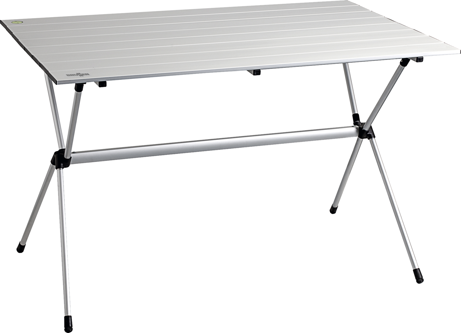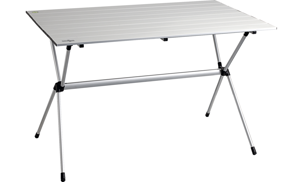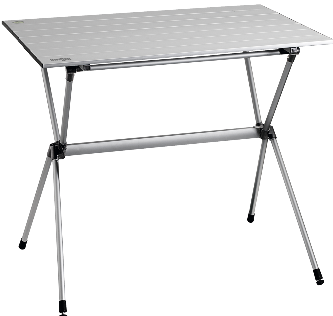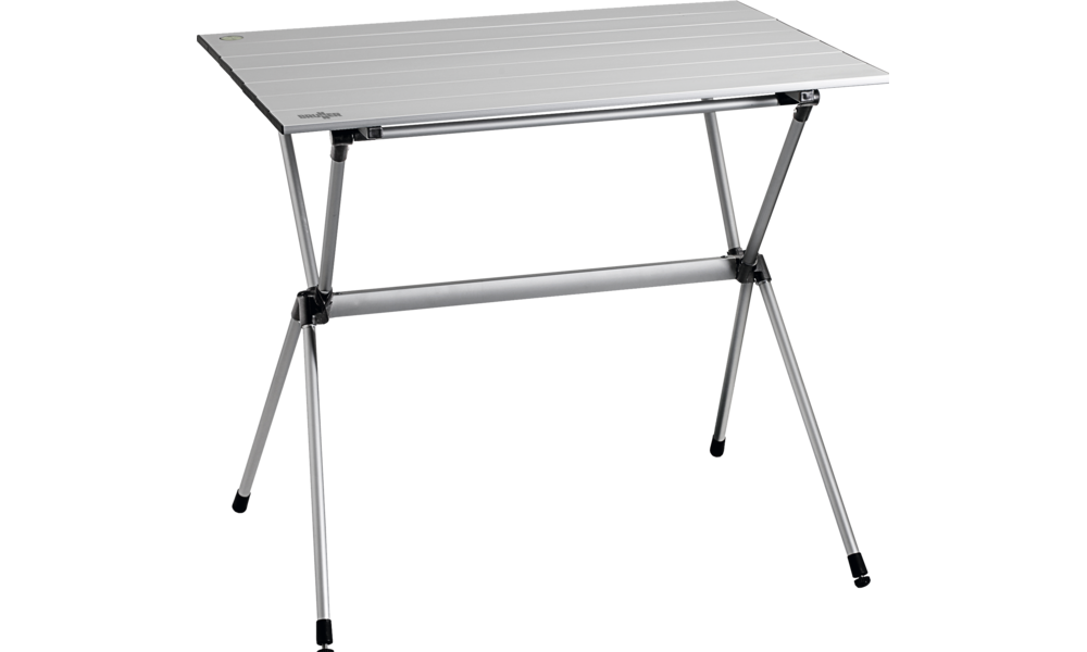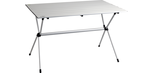 Zusammenklappbarer Außentisch mit ultraleichtem Aluminiumgestell und rollbarer Tischplatte.