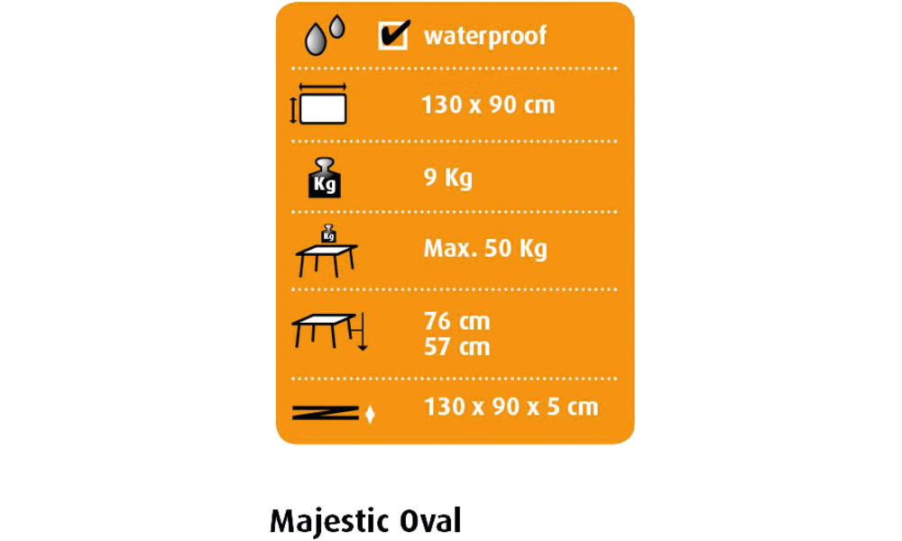Der Tisch der Zukunft! Mit stufenloser Höhenverstellung QUICKGRIP. Damit lässt sich der Tisch ganz einfach auf die gewünschte Höhe einstellen. Die hochwertige, zu 100 % wetterfeste Tischplatte (SEVELIT leicht, hitzebeständig bis zu 180 °C) und das mit Aluminium anodisierte Gestell, machen die Tische MAJESTIC ultraleicht. Jeder Tischfuß hat eine Auflagenvergröβerung welche nachgibt, wenn der Untergrund dies erfordert. Die Tischhöhe ist von 57 bis 76 cm einstellbar. Belastbarkeit 50 kg.