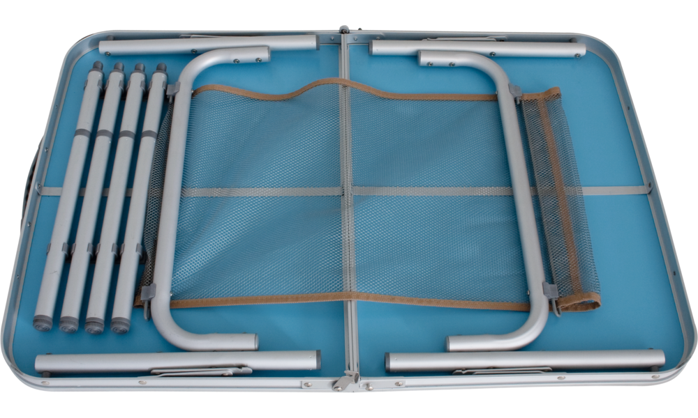 Aluminiumgestell (ø 25 mm) mit praktischer Netzablage unter der Tischplatte. Belastbarkeit 20 kg.