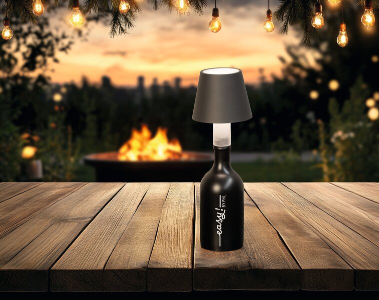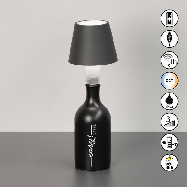 Fiocco Licht trifft Idee. In edlem Grau verwandelt sich die kabellose Fiocco Bottle Lamp im Handumdrehen in ein stilvolles Lichtobjekt einfach auf den Flaschenhals setzen (ø max. 30 mm) und individuelle Lichtmomente genießen. Mit drei einstellbaren Farbtemperaturen (2200 / 2700 / 3500 K) und stufenlosem Sensordimmer passt sich Fiocco deinem Ambiente an von sanftem Stimmungslicht bis zu angenehm hellem Akzentlicht. Die integrierte LED (2,0 W, 190 lm) sorgt für harmonische Ausleuchtung. Der 2000 mAh Akku ermöglicht bis zu 36 Stunden Leuchtdauer kabellos, wetterfest (IP54) und bequem per USB aufladbar.