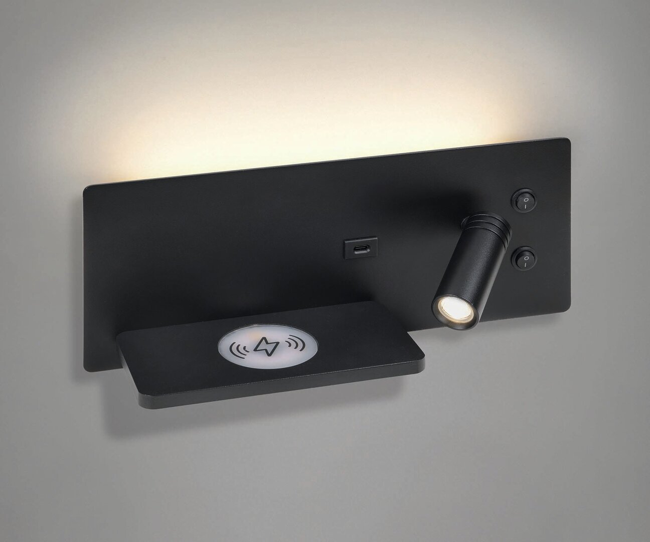 Aluminiumgehäuse, bestückt mit LED-Lesespot, indirekte LEDWandleuchte, USB C-Lader und induktive Lade-Ablagefläche.