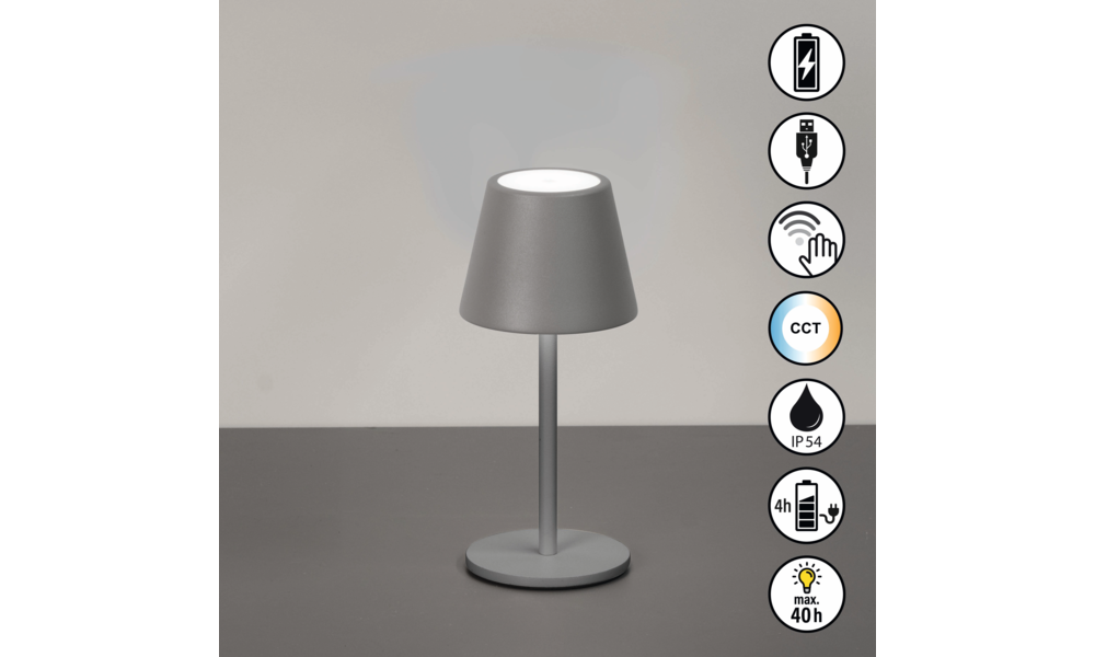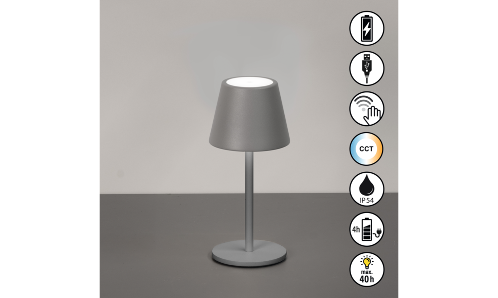 In elegantem Design bringt die kabellose Tischleuchte Salerno unaufdringliche Klarheit in dein Zuhause perfekt für dezente Lichtakzente auf dem Beistelltisch, im Regal oder auf dem Balkon. Die integrierte LED (1,5 W, 140 lm) sorgt mit drei wählbaren Lichtfarben (2200 / 2700 / 3500 K) und stufenloser Dimmung per Sensordimmer für genau die Lichtstimmung, die du brauchst jederzeit anpassbar. Mit bis zu 40 Stunden Akkulaufzeit (1800 mAh), wetterfester Bauweise (IP54) und USB-Ladefunktion ist Salerno überall einsatzbereit drinnen wie draußen.