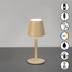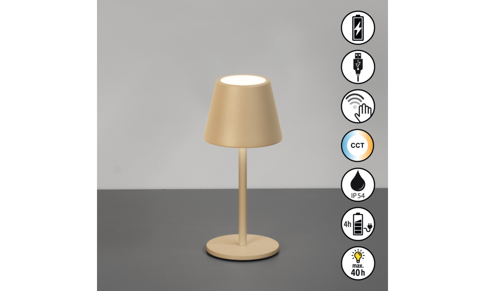 In elegantem Design bringt die kabellose Tischleuchte Salerno unaufdringliche Klarheit in dein Zuhause perfekt für dezente Lichtakzente auf dem Beistelltisch, im Regal oder auf dem Balkon. Die integrierte LED (1,5 W, 140 lm) sorgt mit drei wählbaren Lichtfarben (2200 / 2700 / 3500 K) und stufenloser Dimmung per Sensordimmer für genau die Lichtstimmung, die du brauchst jederzeit anpassbar. Mit bis zu 40 Stunden Akkulaufzeit (1800 mAh), wetterfester Bauweise (IP54) und USB-Ladefunktion ist Salerno überall einsatzbereit drinnen wie draußen.