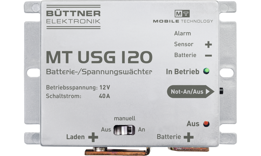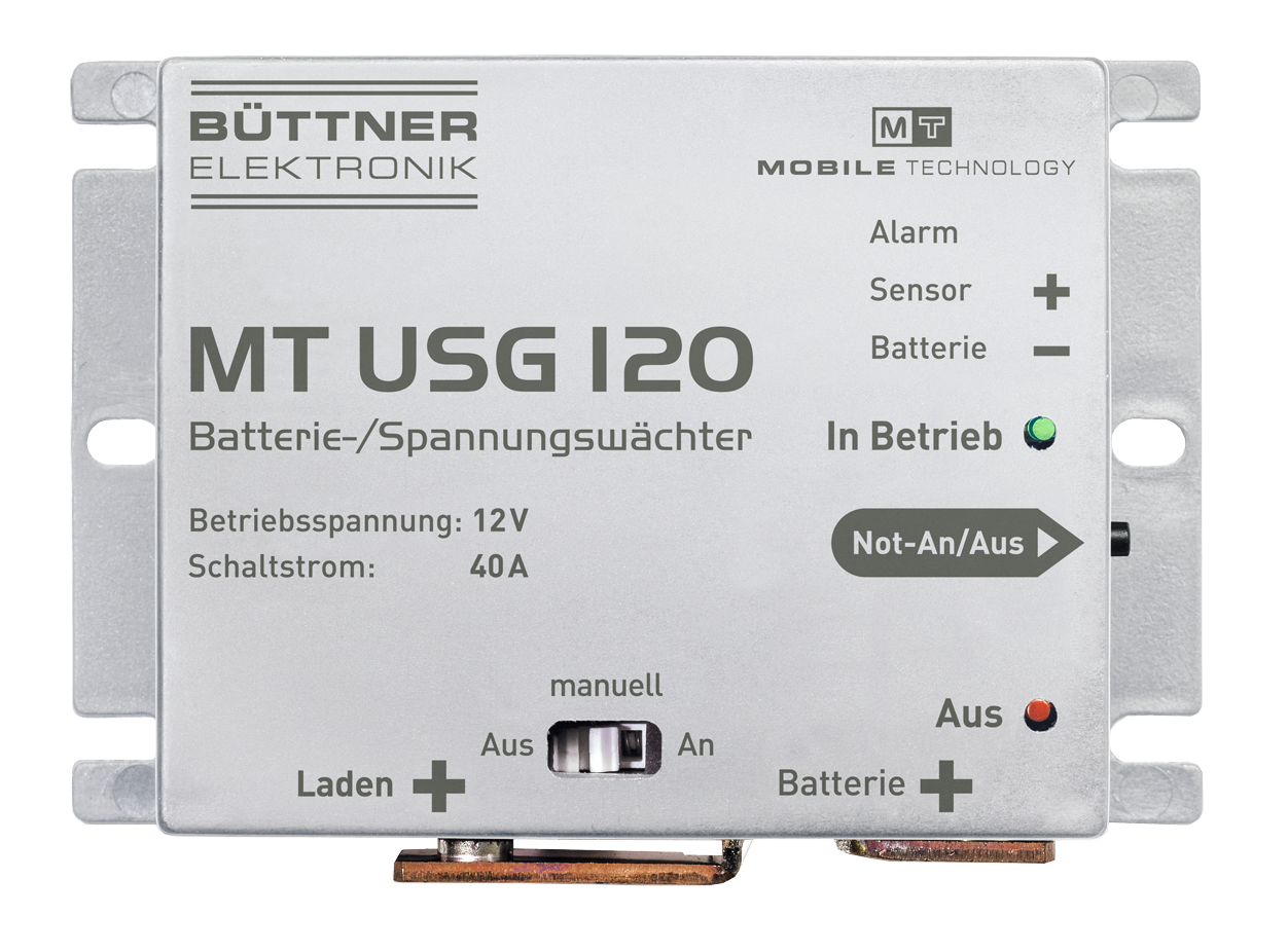 Der MT USG 40 wird zwischen Batterie und die 12 V-Verbraucher geschaltet. Er schützt Batterie sowie Verbraucher vor schädlicher Unterspannung (Verbraucher AUS bei 10,7 V) und die angeschlossenen Verbraucher vor schädlicher Überspannung (AUS bei 15,5 V). Über einen Schaltausgang ist der MT USG 40 fernbedienbar und somit auch als Hauptschalter (alle Verbraucher AUS/EIN) zu verwenden.