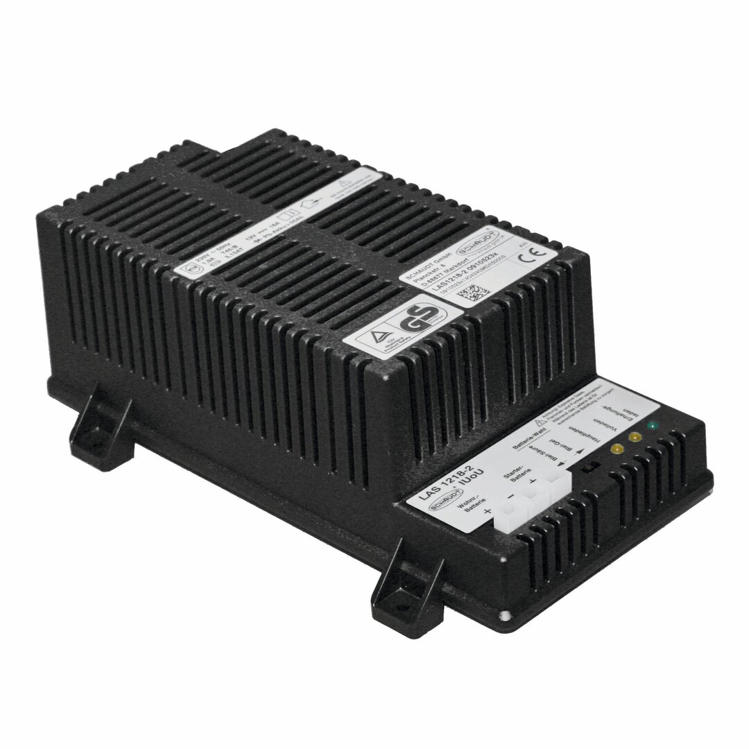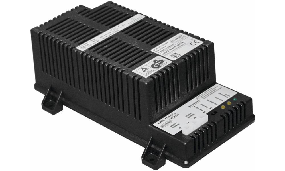 Dadurch kann lüfterlos ein hoher Ladestrom (18 A, Kennlinie IUoU) bei kompakten Abmessungen und geringem Gewicht realisiert werden. Auch zur Verstärkung der Ladung bei Systemen mit Elektroblock. Anzeige der Ladephase, auch zur Stromversorgung (o. Batterie), Nachladung der Starterbatterie, hoher Wirkungsgrad von ca. 90 %.