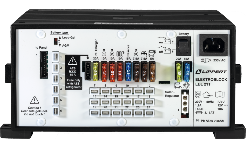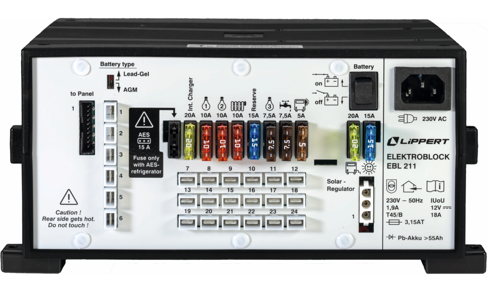 Der Klassiker. Der Elektroblock enthält ein Batterielademodul, koordiniert den kompletten 12 V-Stromkreis und übernimmt noch weitere Steuerungs- und Regelungsfunktionen. Die Bedientafel LT 453 und das vollständige Anschlussmaterial sind im Set enthalten.