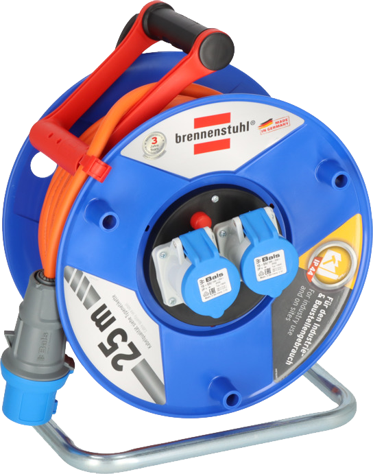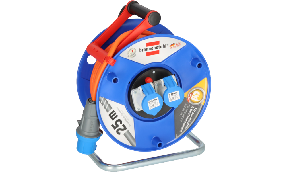 Ausstattung: CEE-Stecker 230 V/16 A,1 CEE-Steckdose 230 V/16 A, 2 spritzwassergeschützte Schutzkontakt-Steckdosen 230 V, Trommelkörper aus Spezialkunststoff auf verzinktem Tragegestell, innovativer Tragegriff „cablepilot“ für perfekte Kabelführung, pendelt auf beiden Seiten und ermöglicht bequemes Tragen und Aufhängen, Kabel (H07RN-F 3G2,5) in Signalfarbe orange, hilfreich um potentielle Stolperfallen zu verhindern.