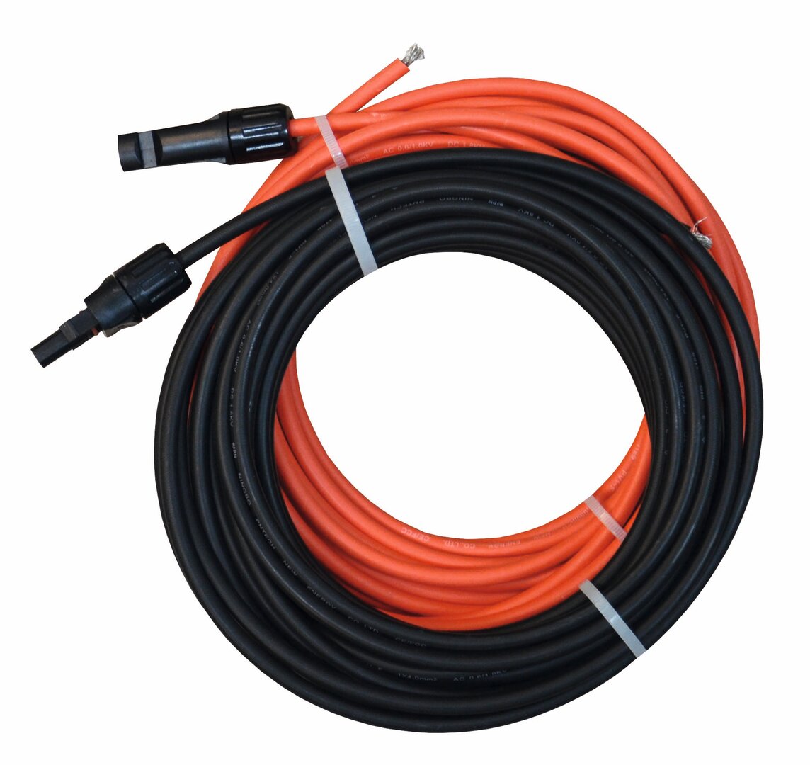 Kunststoffummantelt, sehr flexibel, 2 x 4 mm2, Außen-Ø ca. 8 mm, 10 m lang, rot/schwarz, einseitig konfektioniert mit MC4-Stecker und Kupplung.