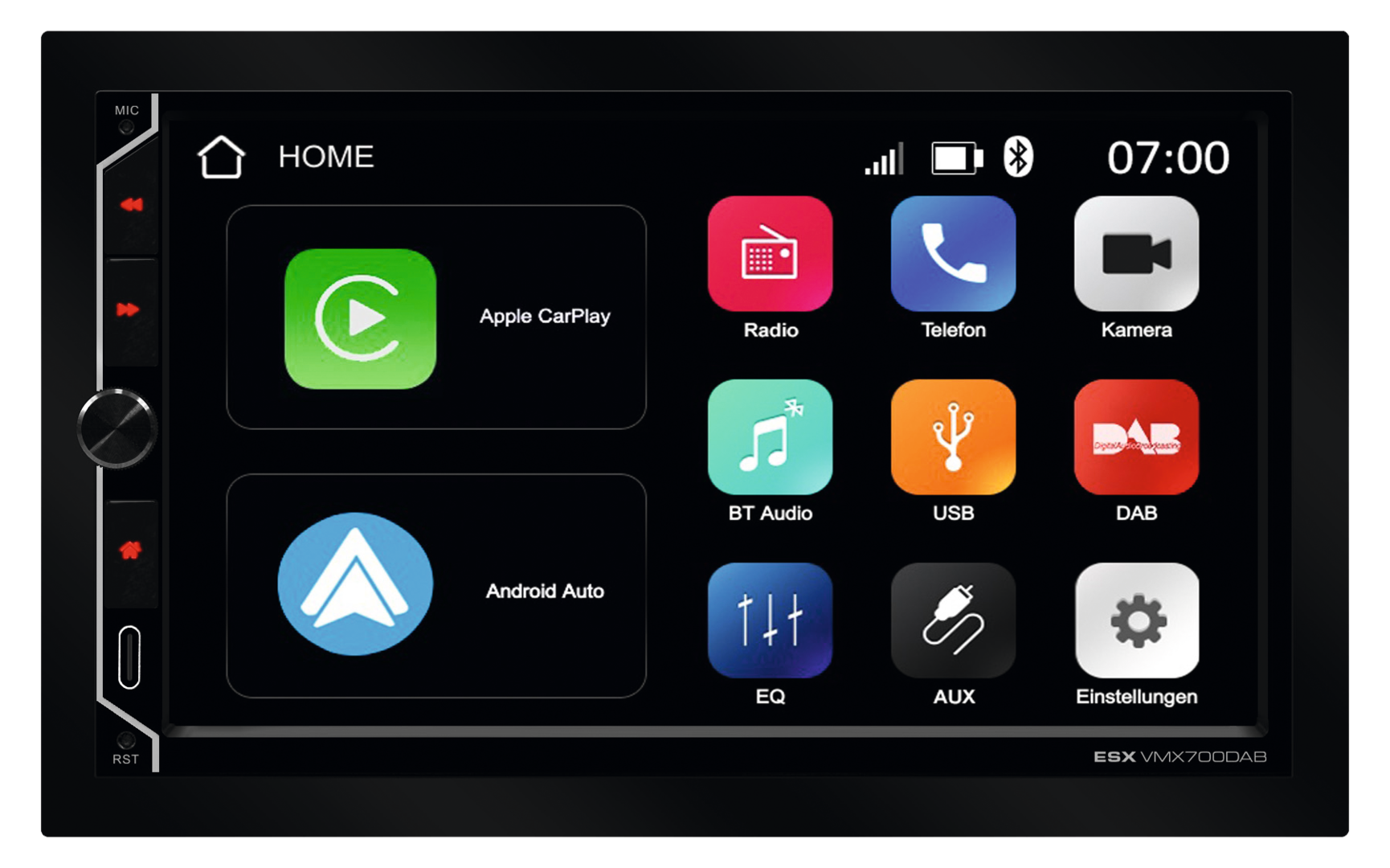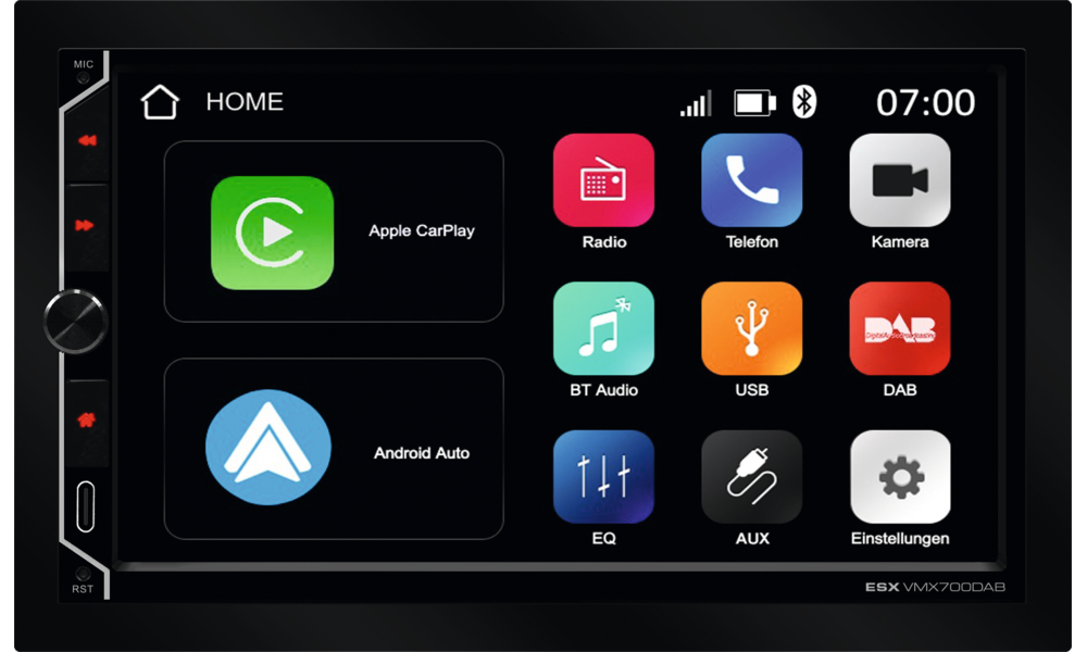 Mit dem neuen VXM700DAB präsentiert ESX einen herausragenden 2-DIN Moniceiver, der in dieser Preisklasse seinesgleichen sucht. Neben einem FM-UKW-Empfangsteil ist natürlich auch digitales Radio (DAB+) integriert. Die Bedienung erfolgt intuitiv über den Touchscreen sowie auch über den praktischen Drehregler auf der linken Vorderseite. Dank der integrierten Bluetooth-Freisprecheinrichtung können Anrufe bequem über den Moniceiver geführt werden, wobei das externe Mikrofon für exzellente Sprachqualität sorgt. Das Telefonbuch wird hierbei auf dem 7-Zoll-Display angezeigt und Kontakte können direkt ausgewählt werden. Darüber hinaus ermöglicht das integrierte Bluetooth-Modul kabelloses Musik-Streaming in hoher Qualität.
