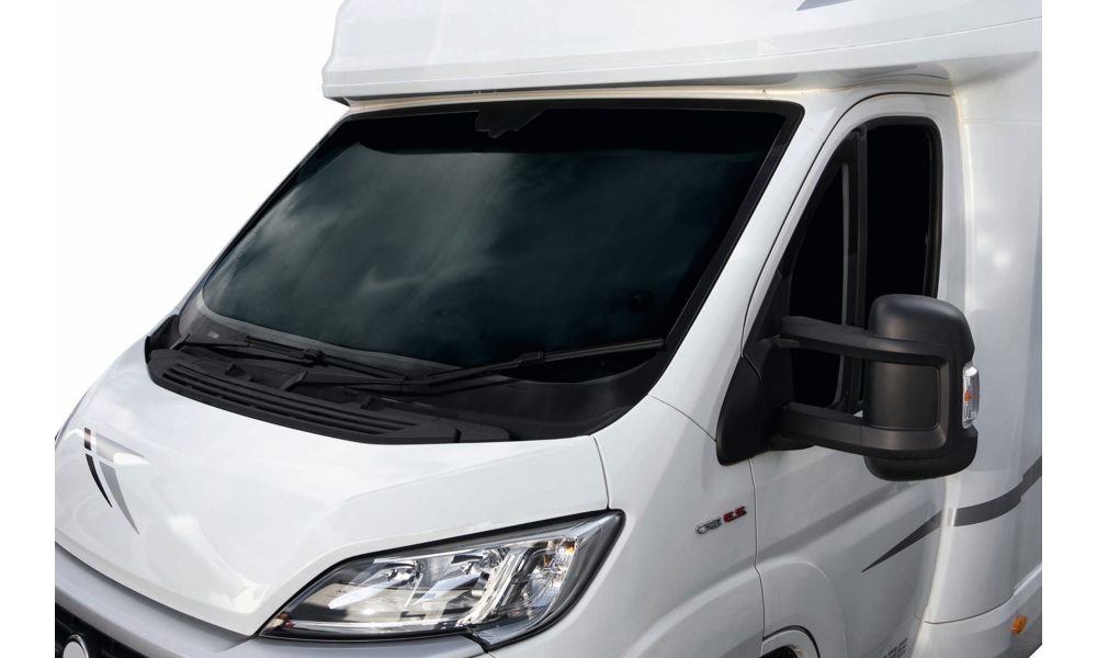 Neues, speziell für die Isolierung und Verdunkelung der Fahrerkabinen-Scheiben entwickeltes Thermomaterial aus Polyester, das sich aufgrund seiner weichen Struktur perfekt an die Form der Scheiben anpasst.