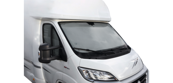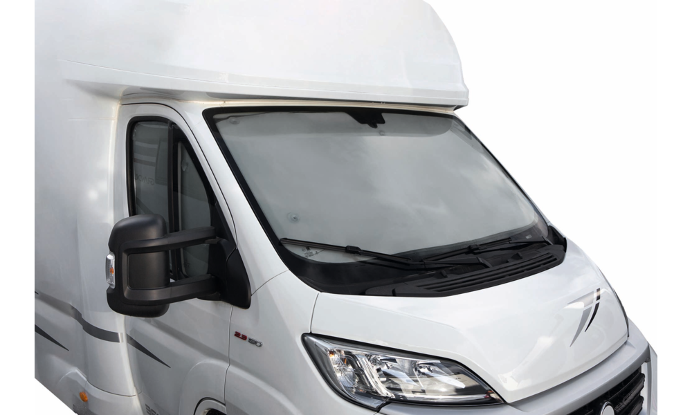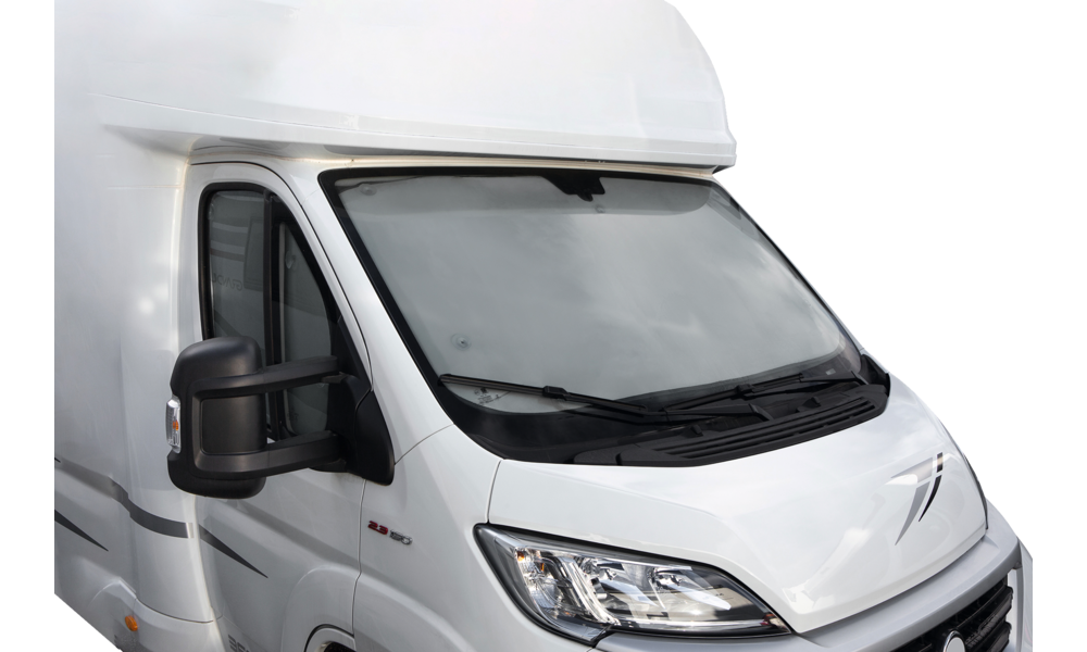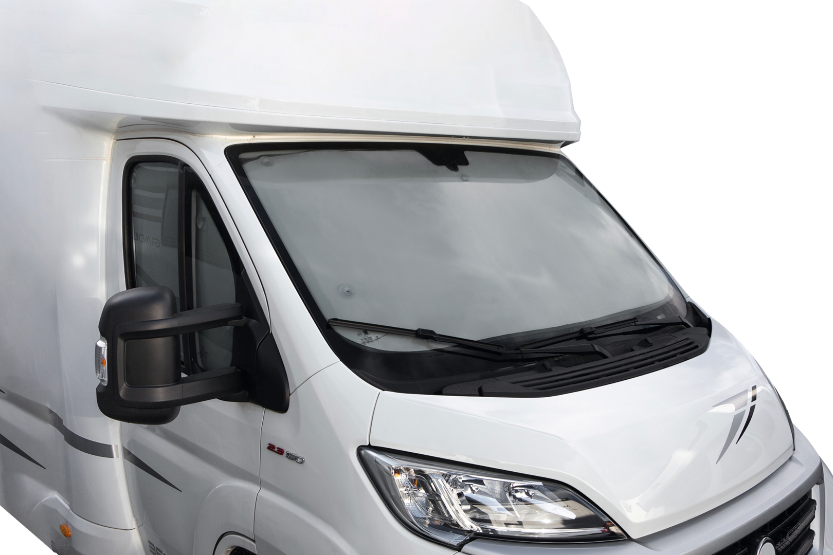 Neues, speziell für die Isolierung und Verdunkelung der Fahrerkabinen-Scheiben entwickeltes Thermomaterial aus Polyester, das sich aufgrund seiner weichen Struktur perfekt an die Form der Scheiben anpasst.