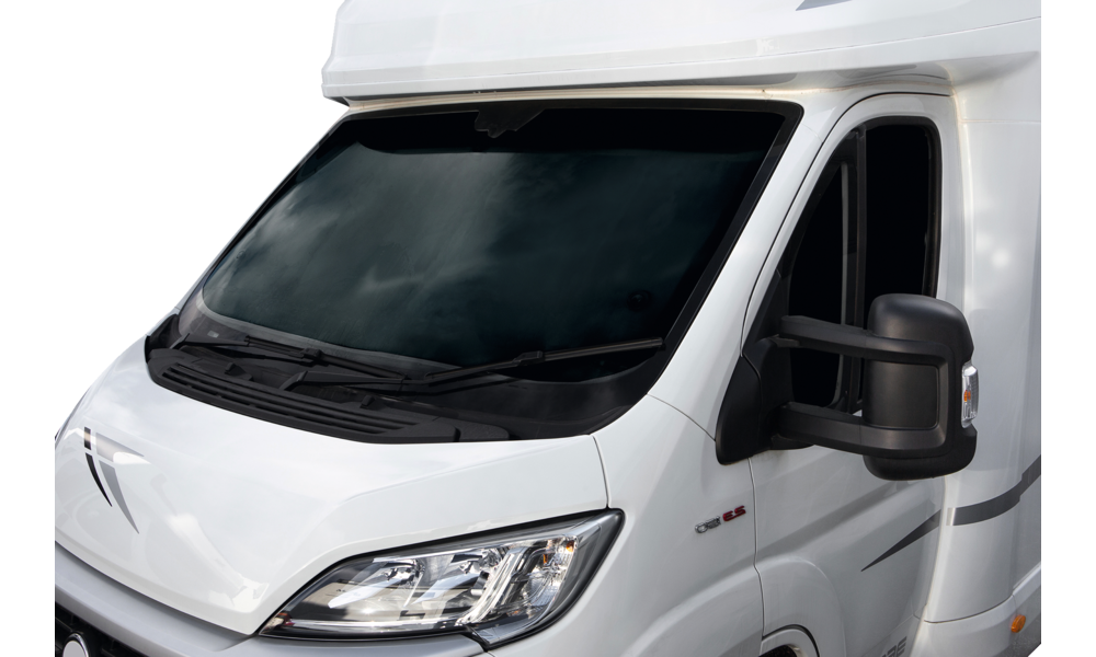 Neues, speziell für die Isolierung und Verdunkelung der Fahrerkabinen-Scheiben entwickeltes Thermomaterial aus Polyester, das sich aufgrund seiner weichen Struktur perfekt an die Form der Scheiben anpasst.