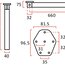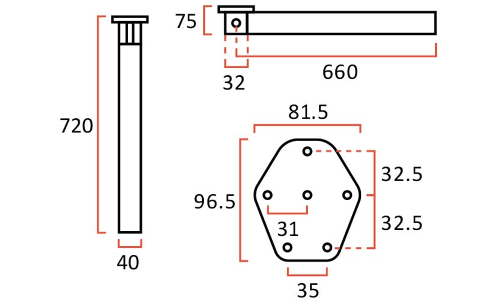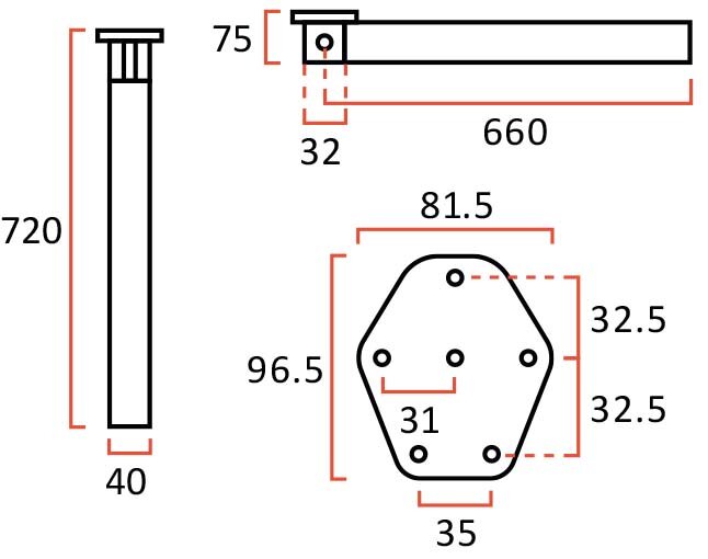 Oben klappbarer Gelenkstützfuß aus extrudiertem, eloxiertem Aluminium. Abmessungen 720 x 40 x 32 mm. Größe Standfuß 49 x 41 mm.