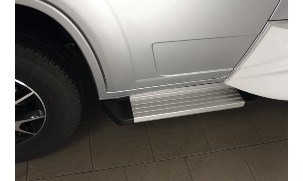 Diese Profilierung gewährleistet ein sicheres Ein- und Aussteigen. Die Freistufe wird durch fahrzeugspezifische und mitgelieferte Edelstahl-Konsolen am und unterm Fahrzeugholm fest verschraubt.