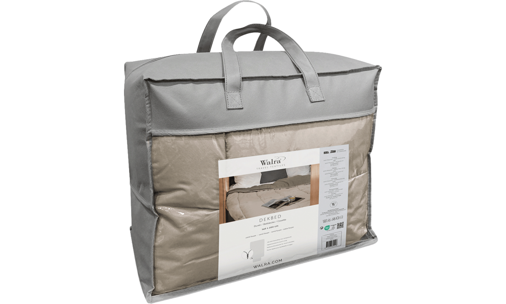 Die ideale Ganzjahres-Bettdecke mit festem Bezug für Wohnmobil oder Wohnwagen. Die Bettdecke wurde so konzipiert, dass sie während des Urlaubs problemlos in der Waschmaschine gewaschen werden kann. Die Bettdecke ist außerdem mit einer praktischen Aufbewahrungstasche und optional einem versteckten, eleganten Reißverschluss versehen, der eine Überdeckung ermöglicht.