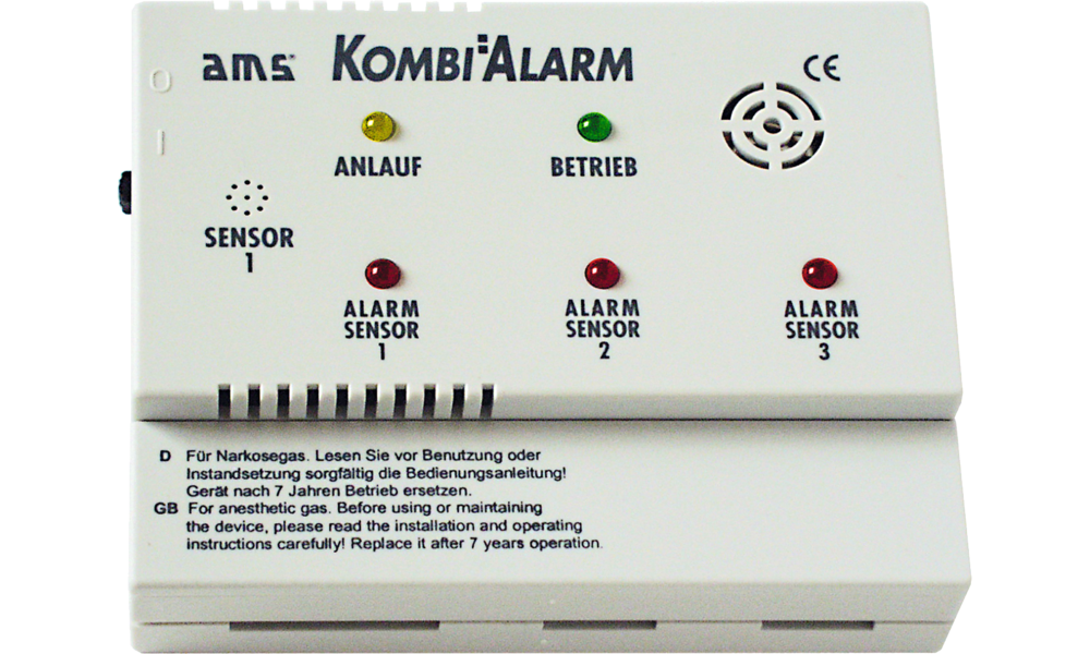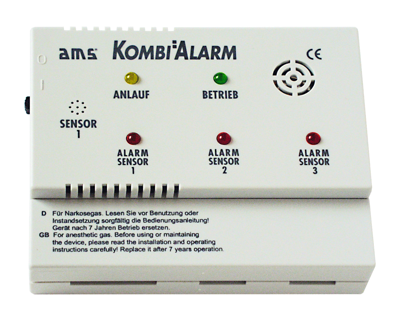 Anschluss an 12 V. Das System ist mit einer speziellen Sensorik ausgestattet, die es erlaubt, das Gerät sowohl als Gasmelder als auch als Narkosegas-Warngerät einzusetzen.