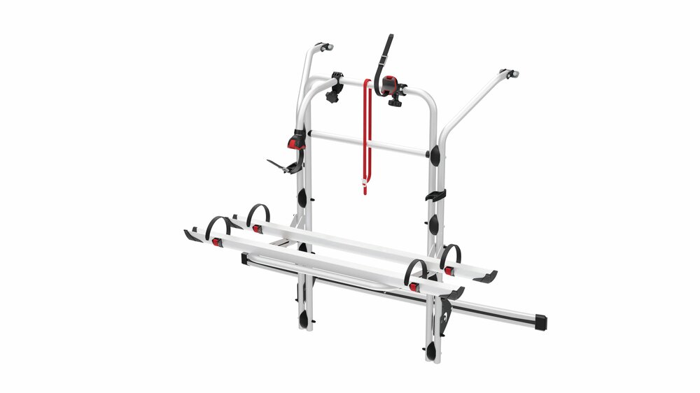 Der Auflagebügel kann entweder in der Standard-Position oder tiefergesetzt montiert werden. Für die tiefergesetzte Position ist der Gebrauch einer Kennzeichenleiste mit Beleuchtung (Nr. 92574) erforderlich. Ermöglicht den Transport von bis zu 4 Standard-Fahrrädern oder 2 E-Bikes.