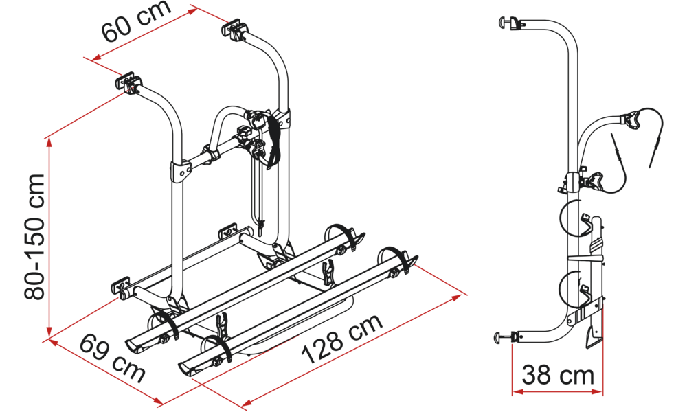 Höhenverstellbarer Rahmen. Für den Transport von bis zu 4 Standard-Fahrrädern oder 2 E-Bikes.