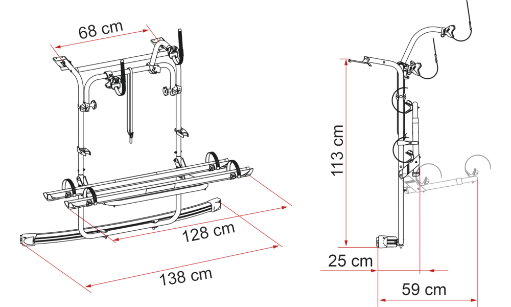 Die obere Gelenkstruktur ermöglicht genaues Einstellen der Position der Bike-Block zur Befestigung der Fahrräder, das praktische untere Spannsystem ermöglicht eine sichere Befestigung des Carry-Bike am Fahrzeug. Die speziell geformten Halterungen werden an den Verstärkungspunkten der Heckklappe eingehängt. Für max. 4 Räder.