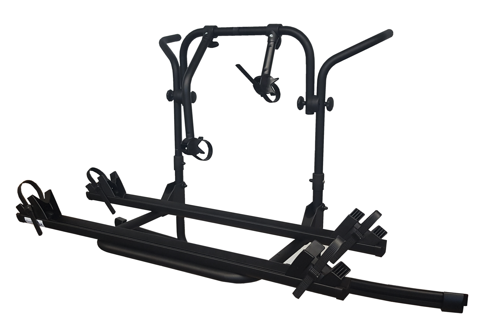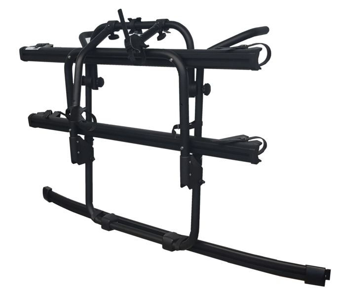 Grundrahmen aus schwarz pulverbeschichtetem Aluminium-Rohr ø 30 mm, 2 Aluminium-Fahrradschienen 125 cm lang mit je 2 Radschalen und 2 Spanngurten, mit 2 Befestigungskrallen. Max. Beladung 2 Fahrräder. Abmessungen (BxHxT) 154 x 94 x 76 cm.