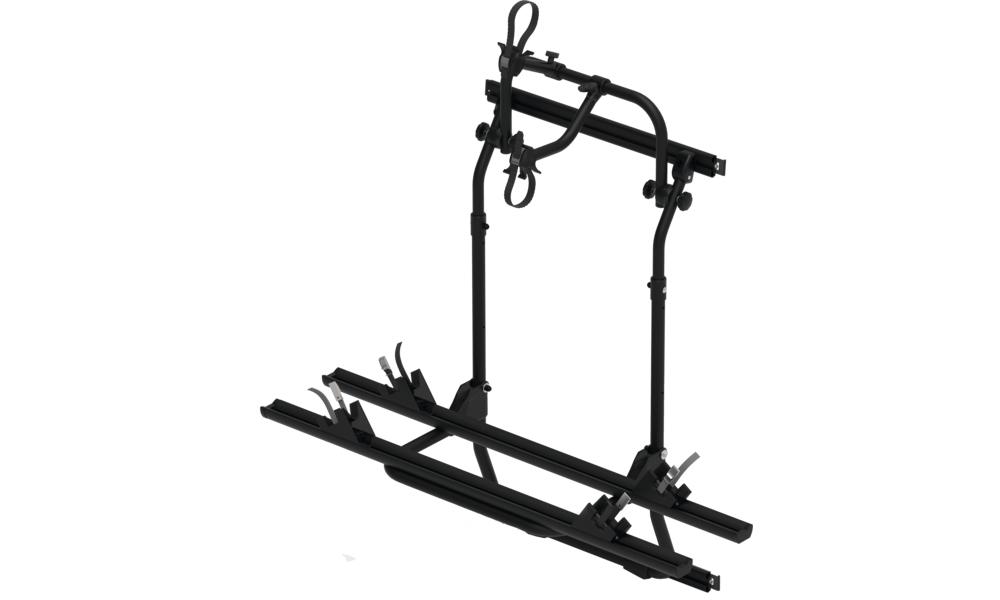 Grundrahmen aus eloxiertem Alu-Rohr, 2 Aluminium Fahrradschienen 137 cm lang mit je 2 Radschalen, 2 Ratschenbänder, 2 Befestigungskrallen und 2 Spannschienen zur Montage am Fahrzeug. Max. Beladung bis