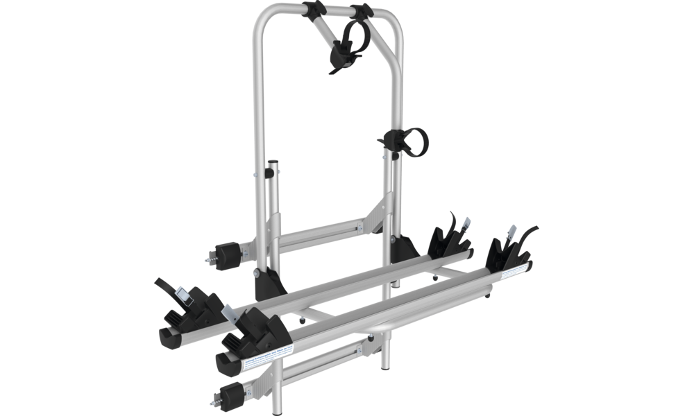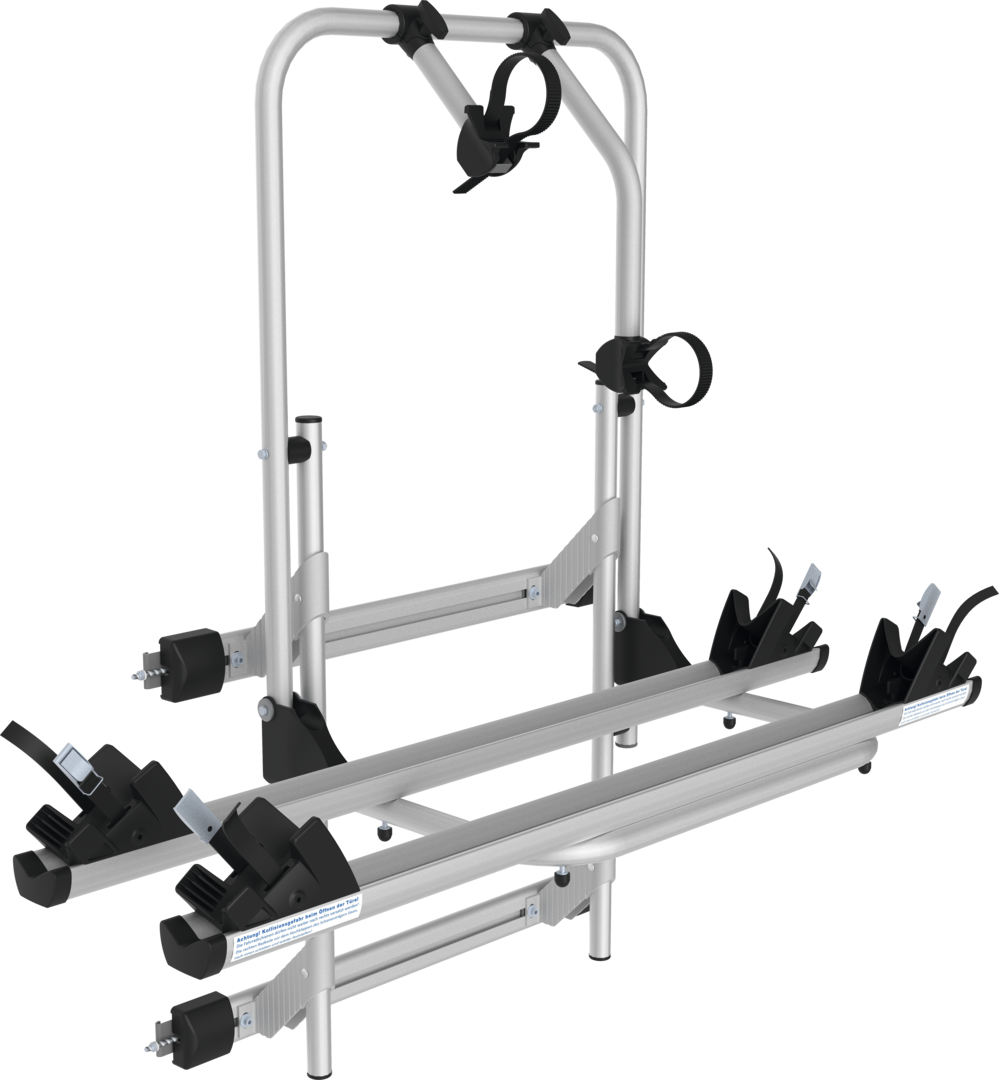 Befestigung an der rechten Fahrzeugtür. Muss zusätzlich mit Schrauben oder Sikaflex am Fahrzeug fixiert werden (nicht im Lieferumfang enthalten). Grundrahmen aus eloxiertem Alu-Rohr, 2 Aluminium Fahrradschienen mit je 2 Radschalen und Spanngurten, 2 Befestigungskrallen, 2 Spannschienen zur Montage am Fahrzeug. Max. Beladung bis zu 2 Fahrräder.