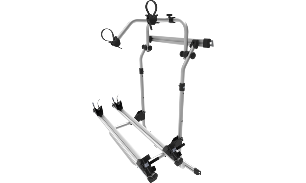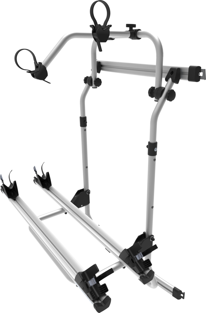 Grundrahmen aus eloxiertem Aluminium bzw. pulverbeschichteter Feinstruktur-Seidenmatt. 2 Fahrradschienen mit je 2 Radschalen, 2 Spanngurten, 2 Befestigungskrallen und 2 Spannschienen zur Montage am Fahrzeug.