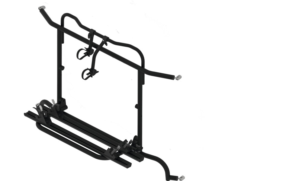 Für den Transport von max. 2 Fahrrädern. Trägerausstattung: Pulverbeschichtetes Aluminium-Rohr in schwarz matt, ø 42 mm, 2 Aluminium Fahrrad-schienen 137 cm lang mit je 2 Radschalen inkl. 2 Ratschenbänder, 2 Befestigungskrallen.