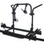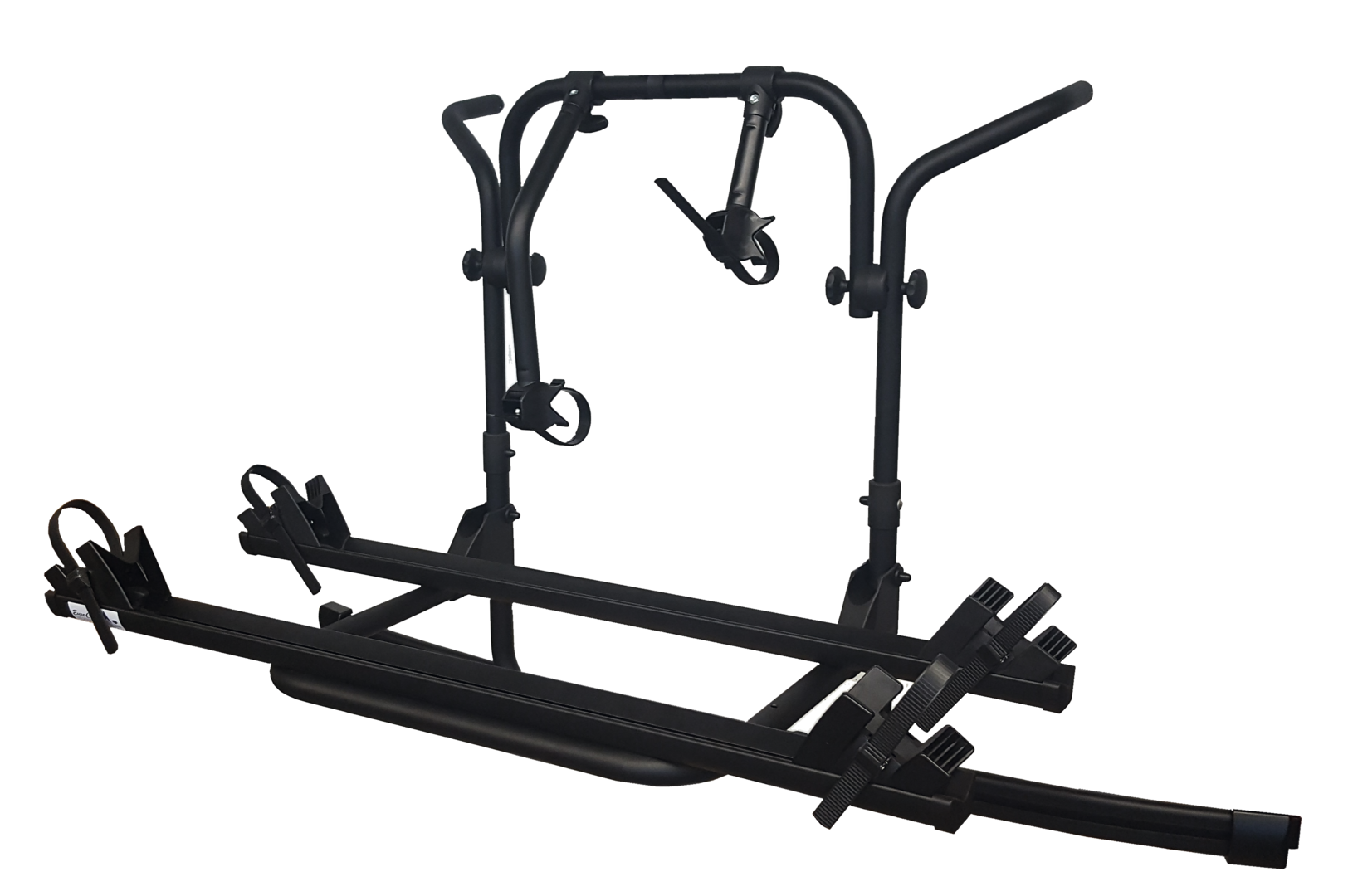 Grundrahmen aus schwarz pulverbeschichtetem Aluminium-Rohr ø 30 mm, 2 Aluminium-Fahrradschienen 125 cm lang mit je 2 Radschalen und 2 Spanngurten, mit 2 Befestigungskrallen. Max. Beladung 2 Fahrräder.
