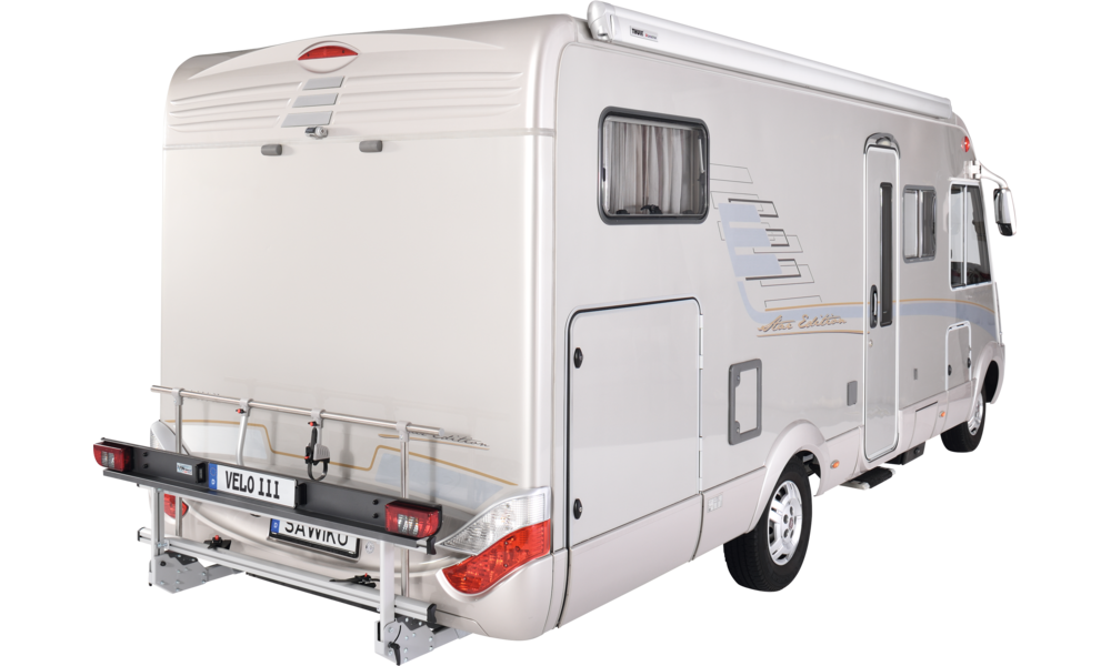 Der VELO III bietet hier die optimale Lösung. Direkt am Rahmen des Reisemobils befestigt, ist er stabil montiert. Auch die Beladehöhe ist geringer, so dass er bequem beladen werden kann. Durch sein geringes Eigengewicht von ca. 16 kg, erlaubt der VELO III eine hohe Nutzlast von 80 kg*. Die Transportplattform des VELO III kann platzsparend hochgeklappt werden. Auch die Fahrradschienen und die praktischen Ratschen-Schnellverschlüsse an den Radschalen und Haltearmen sind optimal auf E-Bikes abgestimmt.