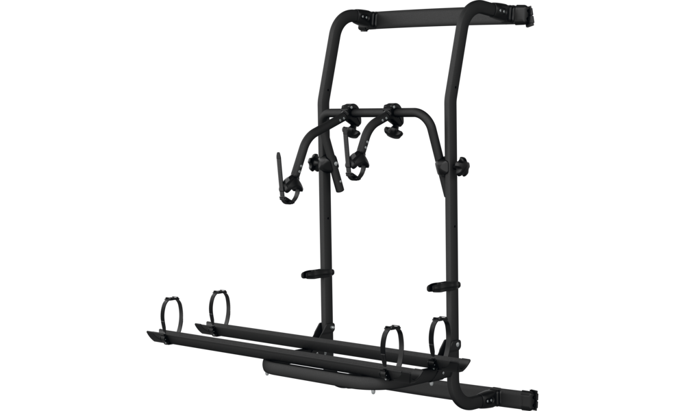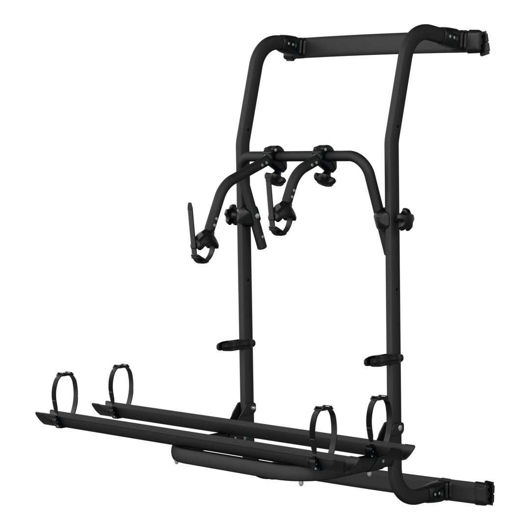 Dieser Mehrzweck-Fahrradträger kann an der rechten Hintertür des Kastenwagens montiert werden und ermöglicht es diese zu öffnen, wenn die Fahrräder geladen sind.