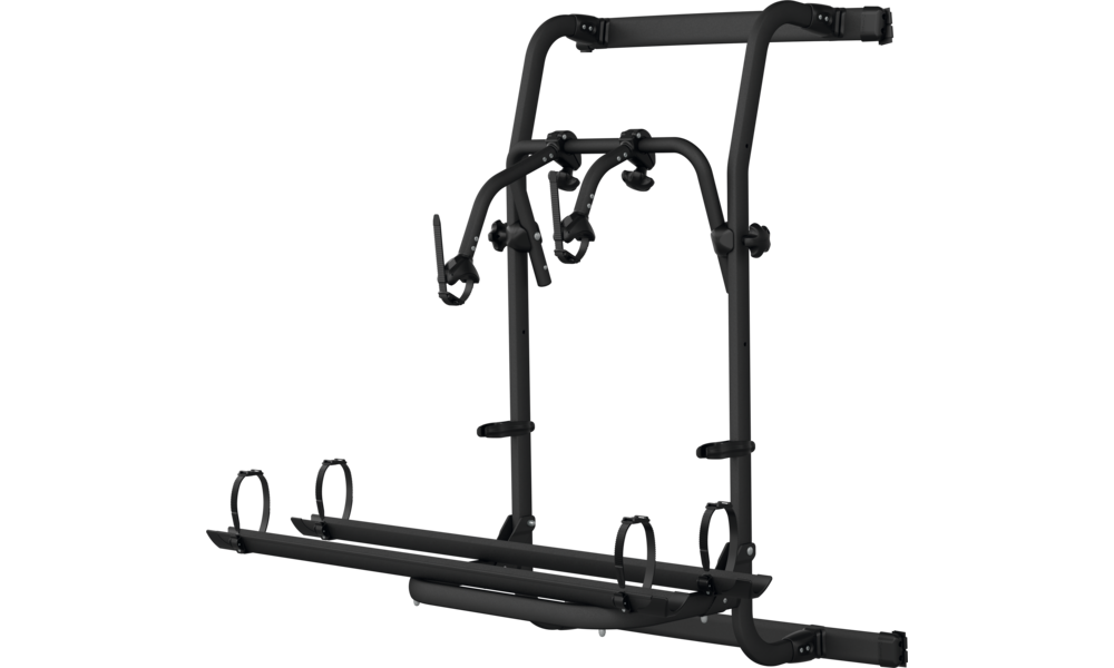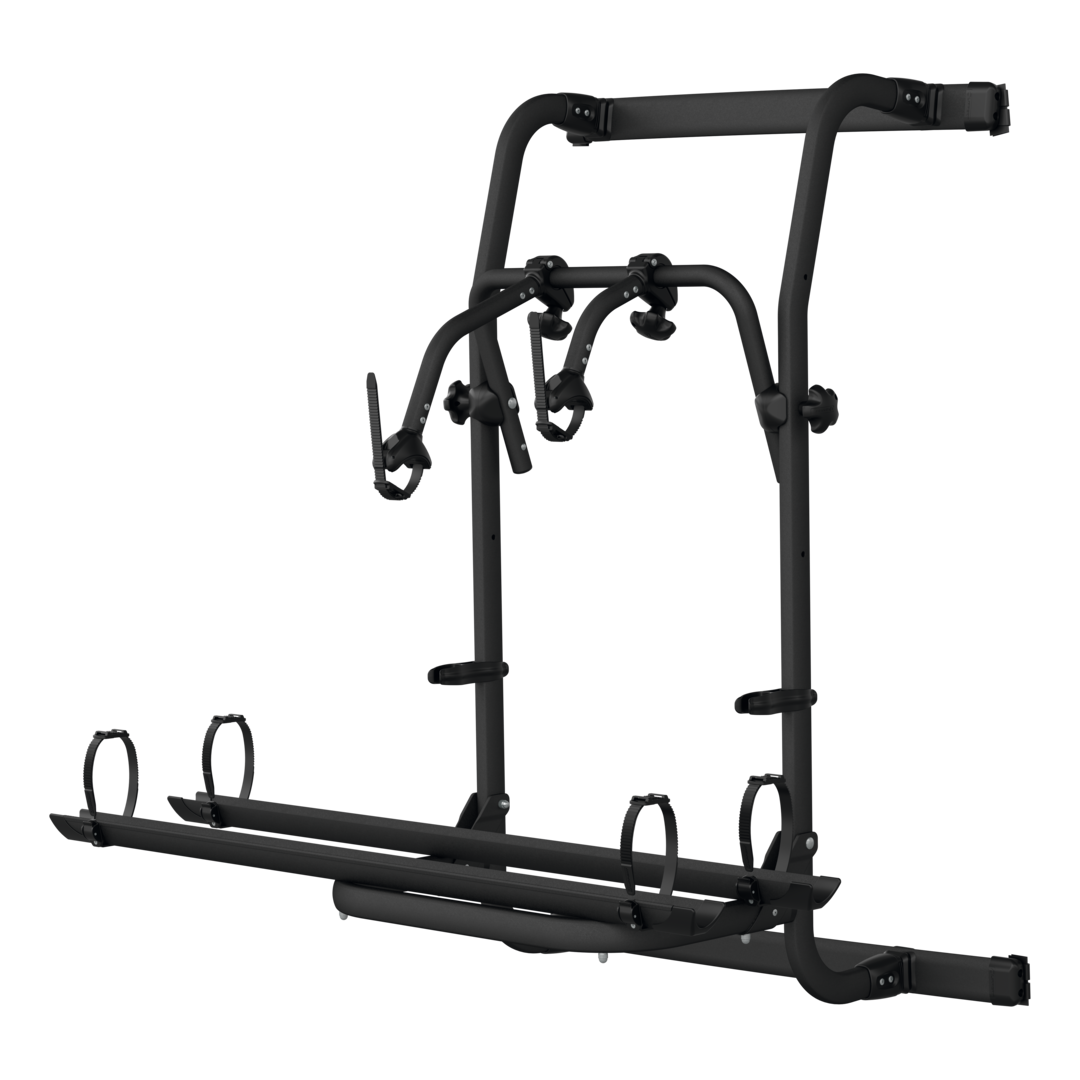 Dieser Mehrzweck-Fahrradträger kann an der rechten Hintertür des Kastenwagens montiert werden und ermöglicht es diese zu öffnen, wenn die Fahrräder geladen sind.