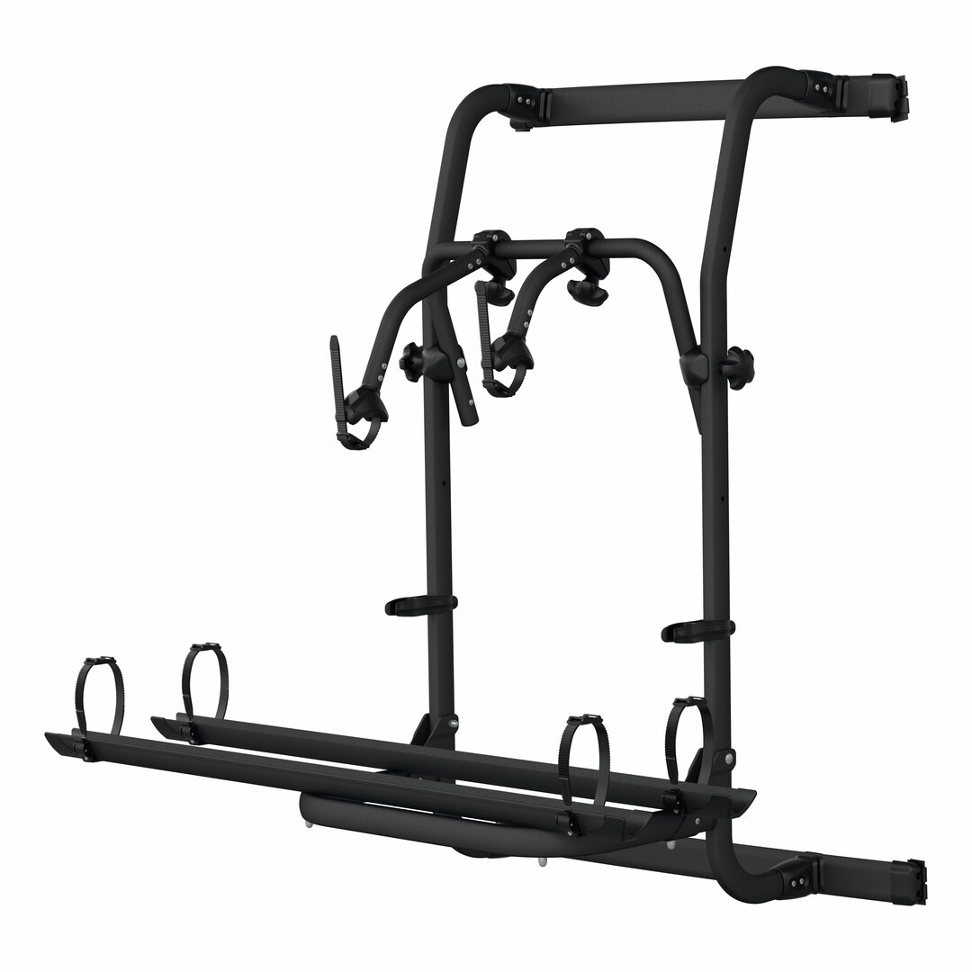 Dieser Mehrzweck-Fahrradträger kann an der rechten Hintertür des Kastenwagens montiert werden und ermöglicht es diese zu öffnen, wenn die Fahrräder geladen sind.