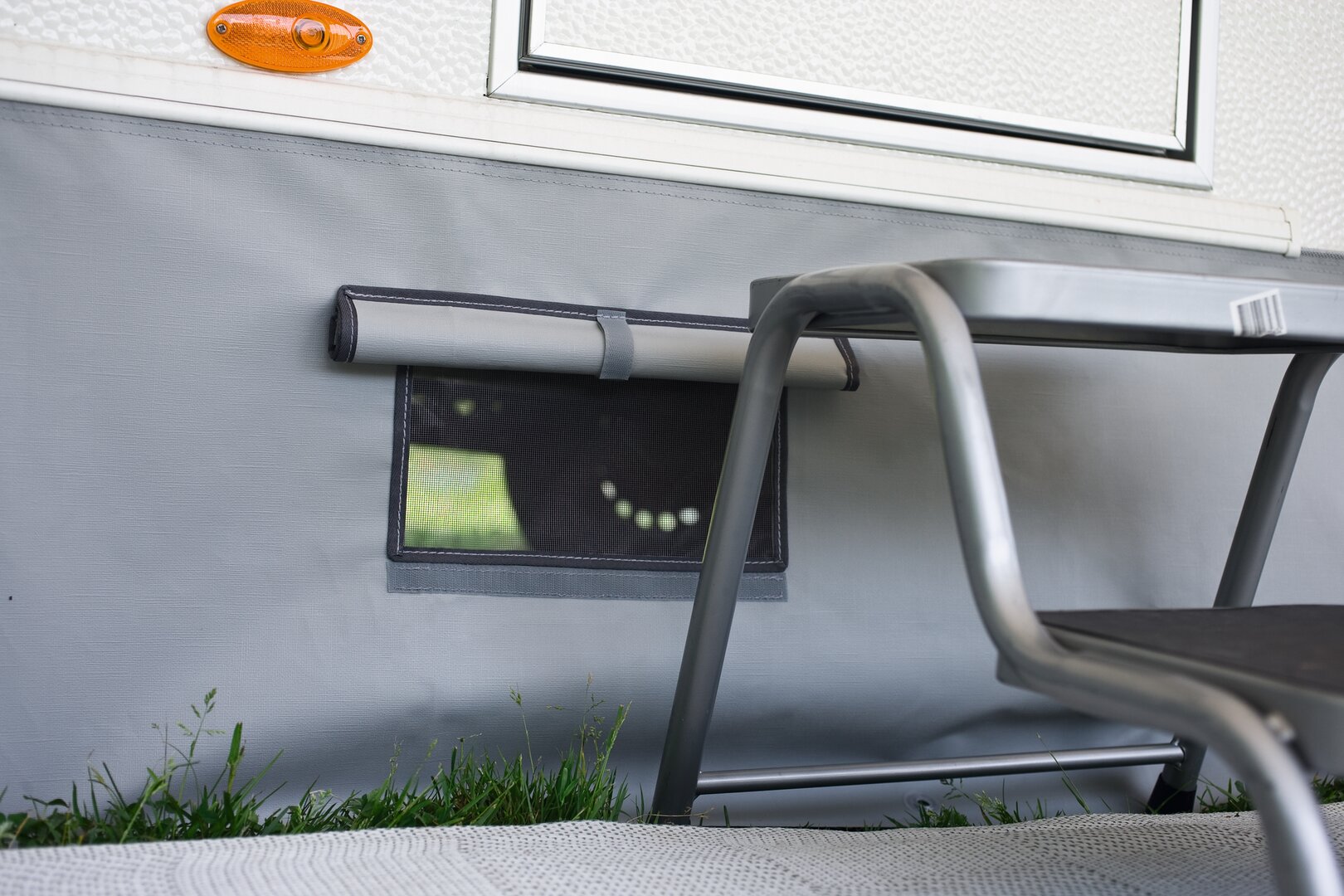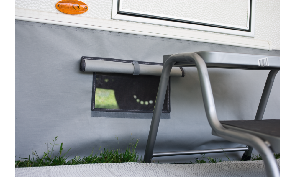 Windblende aus hochwertigem, beidseitig kunststoffbeschichtetem Polyestergewebe.
