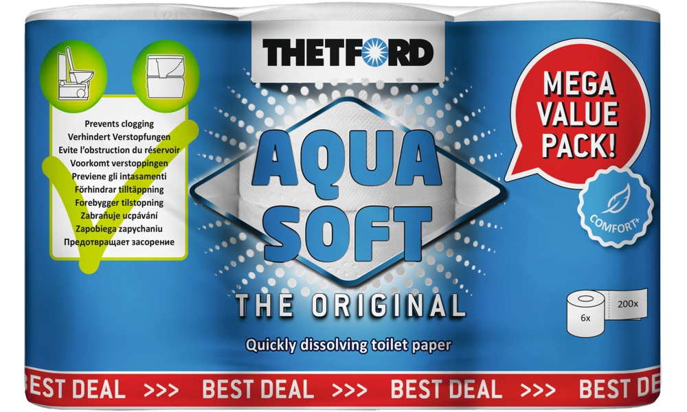 Ein speziell entwickeltes superweiches Toilettenpapier, das sich schnell im Fäkalientank auflöst, um Verstopfungen zu verhindern und das Entleeren zu erleichtern.
