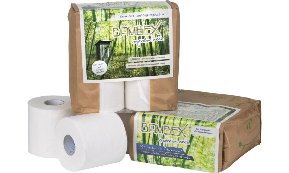 CO-Toilettenpapier BAMBEX. Die nachhaltige Alternative. Keine Farb- und Duft-stoffzusätze, angenehm weich, 100 % holzfrei und biologisch abbaubar. 3-lagiges Toilettenpapier - 4 Rollen á 250 Blatt.