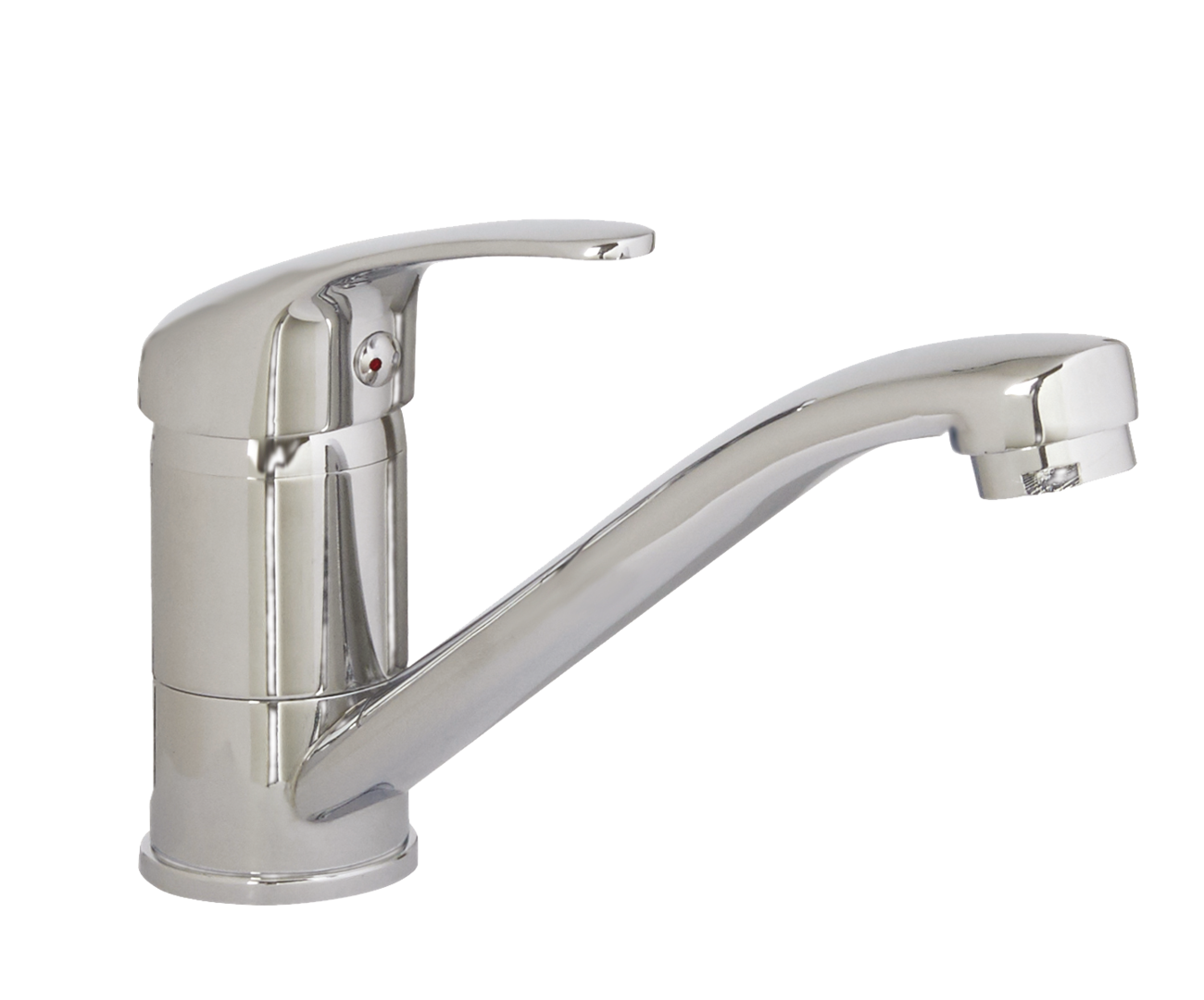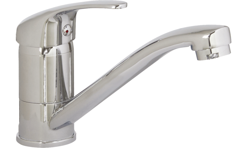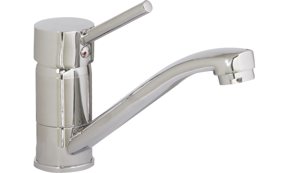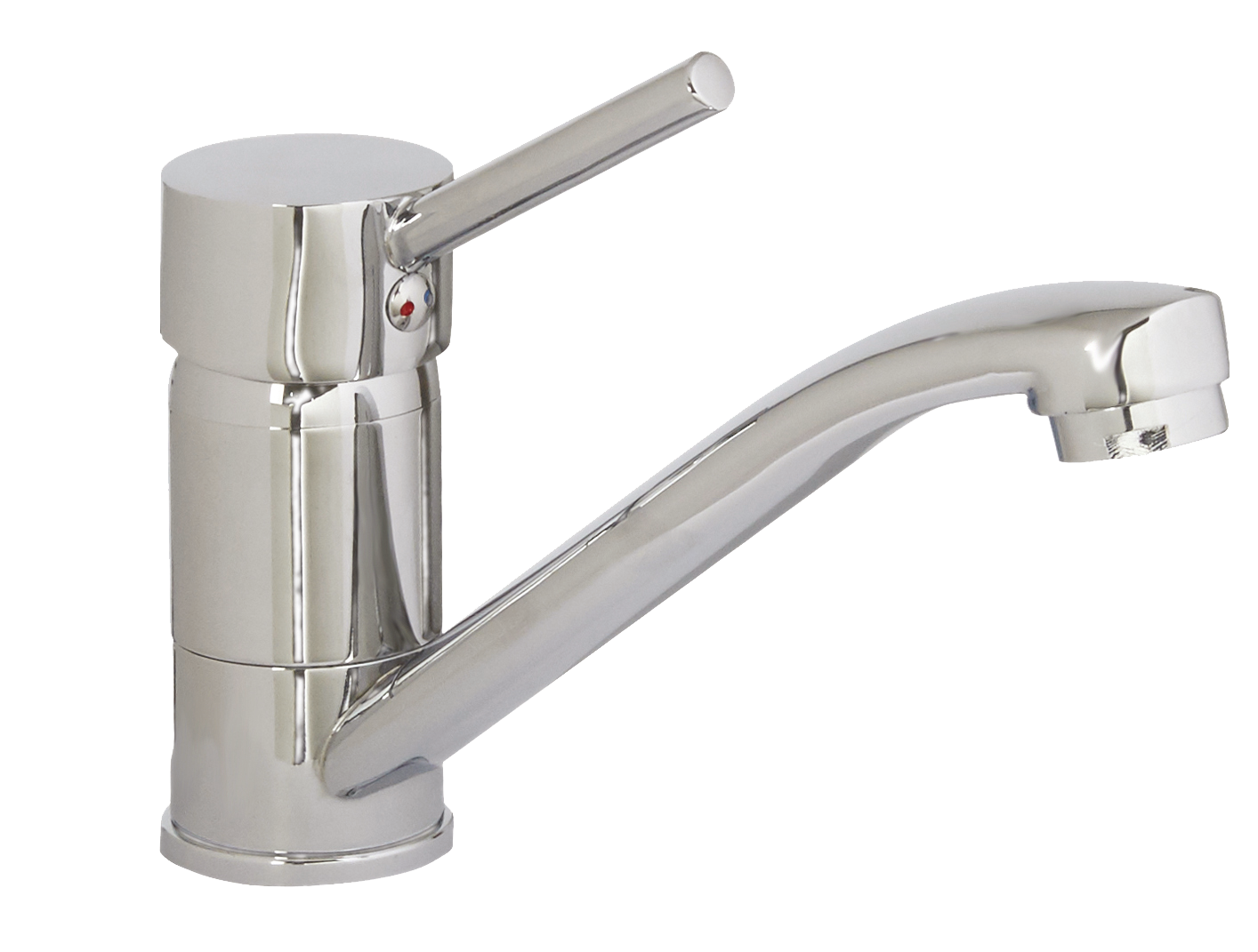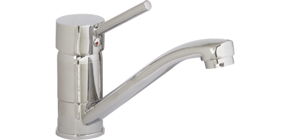 Einhebelmischer aus Metall mit Edelstahl-Zulaufschläuchen.