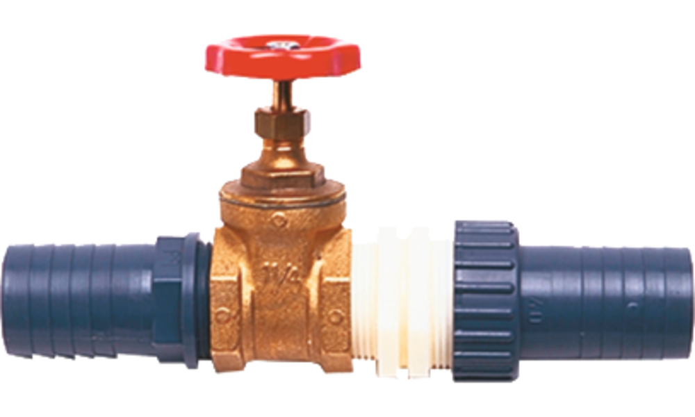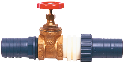 Entleerungsgarnitur. Der Tankablaufstutzen wird mit einem 40 mm Schlauch mit der Garnitur verbunden.