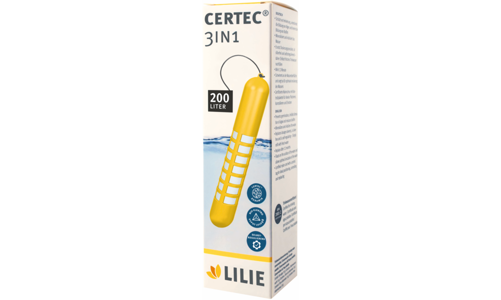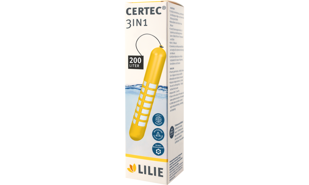 Die besondere Dreifachwirkung der Kapsel verhindert Verkeimung und die Bildung von Biofilm (Schlieren). Außerdem versorgt es das Wasser mit Mineralien. Certec® 3in1 schwimmt an der Wasseroberfläche wie eine Boje und kann durch die zertifizierte Nylonschnur jederzeit bequem aus dem Tank gefischt werden.