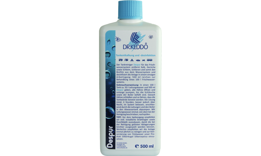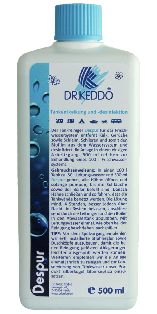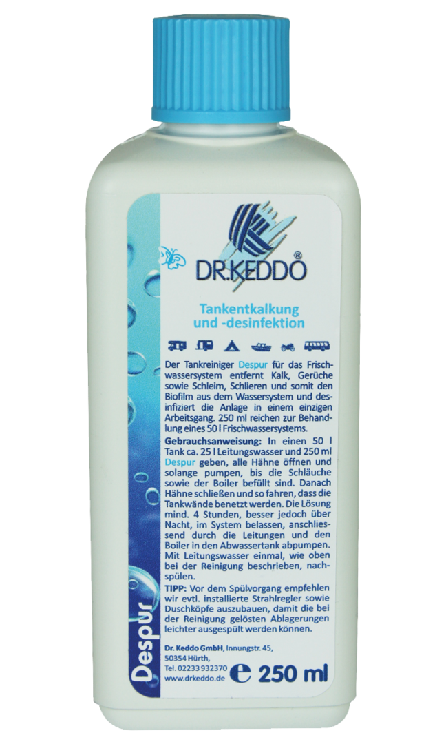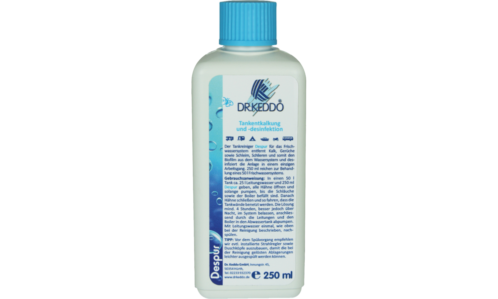 Despur entfernt Kalk, Schleim, Schlieren und Bakterien vollständig aus dem Wassersystem/Frischwassertank.