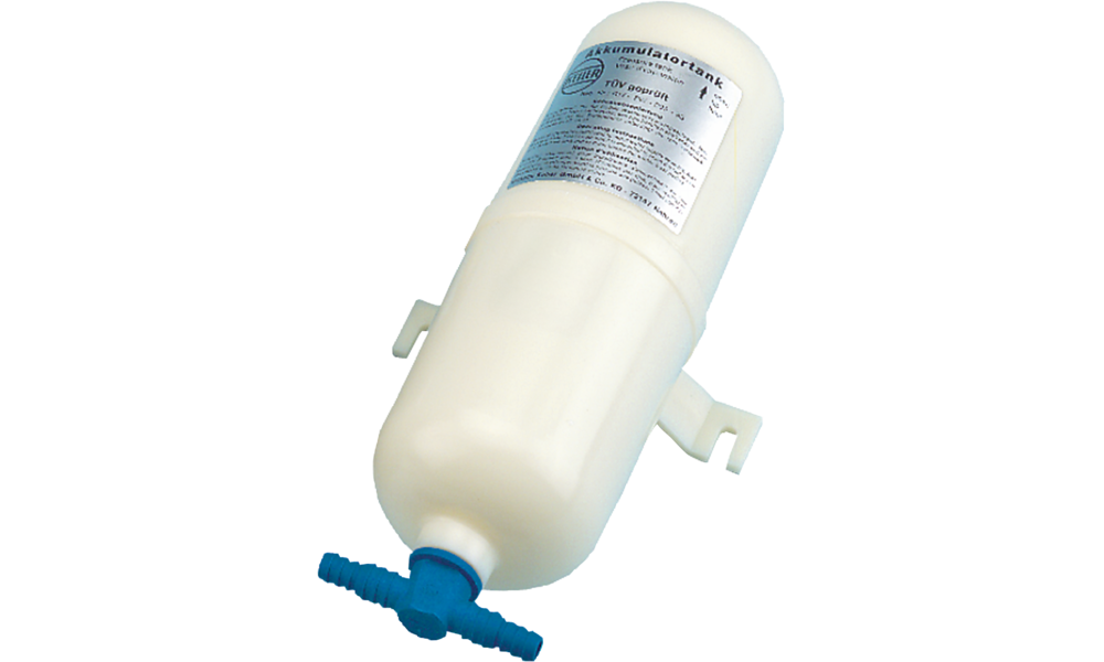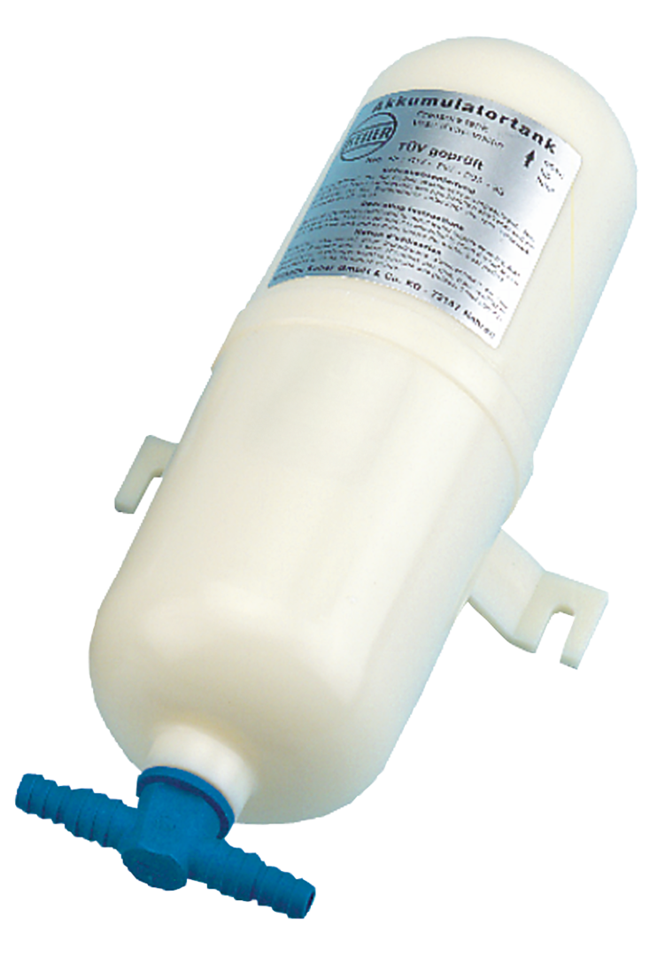 Druckausgleichstank. Fördert bei Druckwasseranlagen einen gleichmäßigeren Wasserfluss und reduziert selbständiges, unnötiges An- und Abschalten der Pumpe. Bis max. 4 bar.