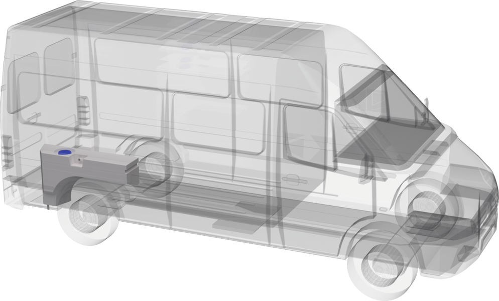 Dieser Tank ist trinkwasserecht und verfügt über eine Serviceöffnung (Ø14 cm). Er wird am Radlauf hinten rechts im Kastenwagen montiert.