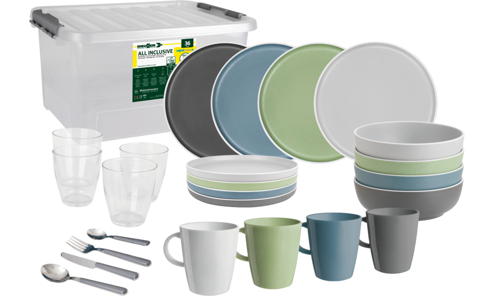 36-teiliges Set bestehend aus 4 Esstellern ø 25 cm, 4 Desserttellern ø 20 cm, 4 Suppentellern ø 20 cm, 4 Henkelbechern 30 cl, 4 Gläsern 20 cl und 16-teiligem Besteckset.