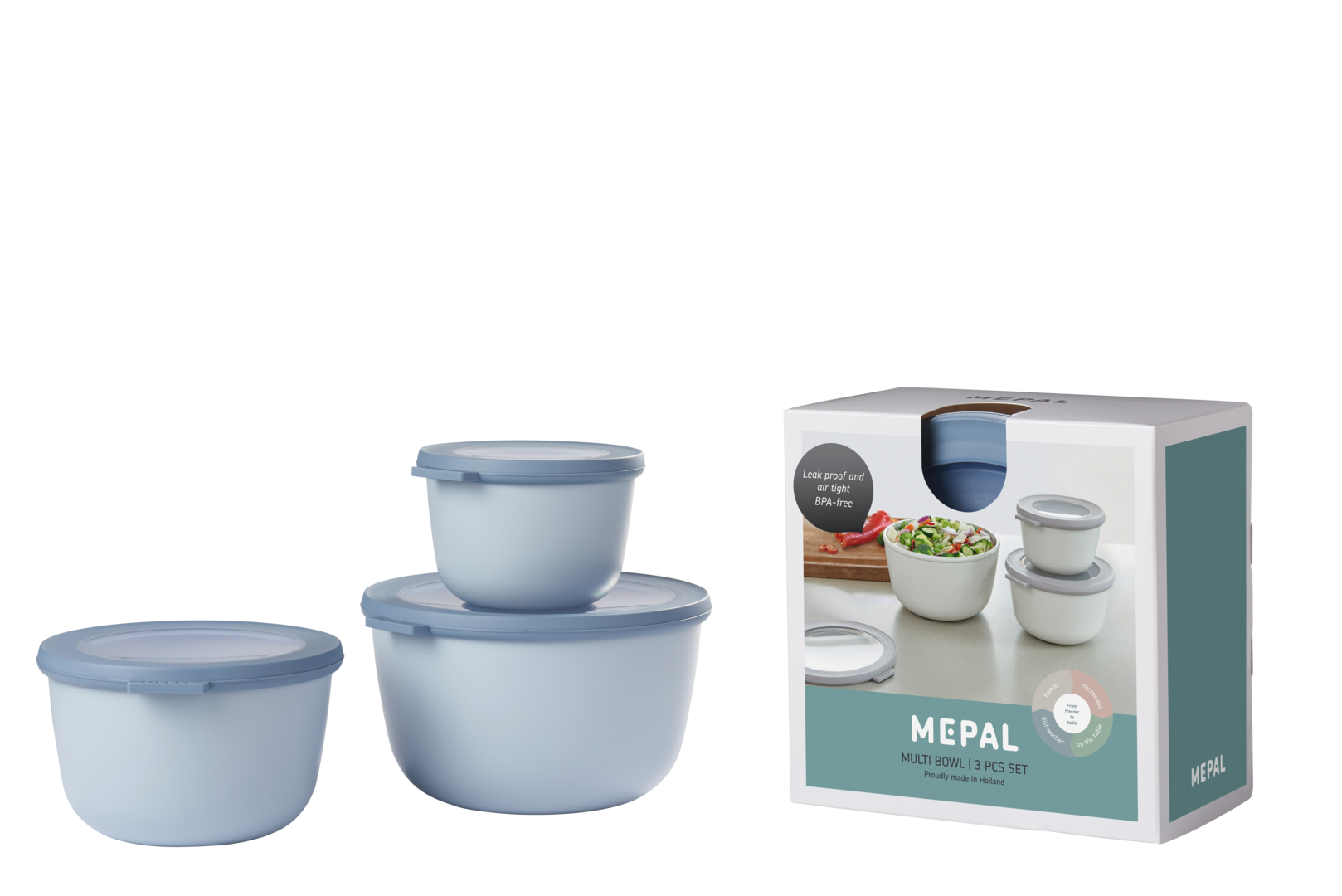 In der Multischüssel Cirqula lassen sich Speisen im Kühlschrank oder Tiefkühler aufbewahren, (ohne Deckel) in der Mikrowelle aufwärmen und direkt am Tisch servieren - alles in ein und derselben Schüssel. Durch das Sichtfenster im auslaufsicheren Deckel hat man immer einen Blick auf den Inhalt. Die bruchfesten Schüsseln sind spülmaschi-nenfest, die einzelnen Größen lassen sich mit Deckel perfekt übereinander oder platzsparend ineinander stapeln.