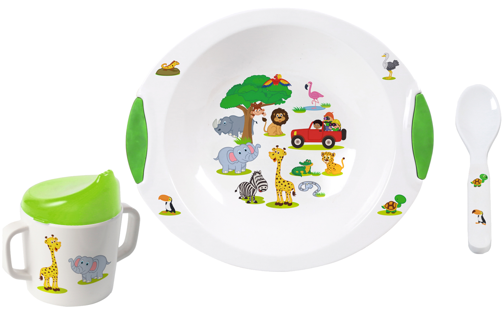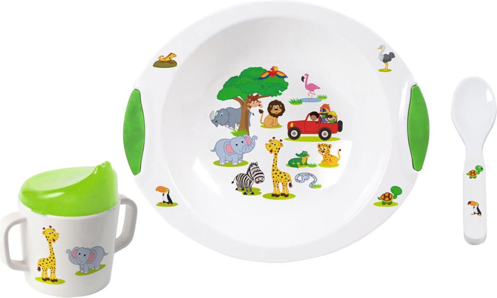 Kindergeschirrset Jungle Parade. 3-teiliges Kindergeschirrset aus hochwertigem Melamin.